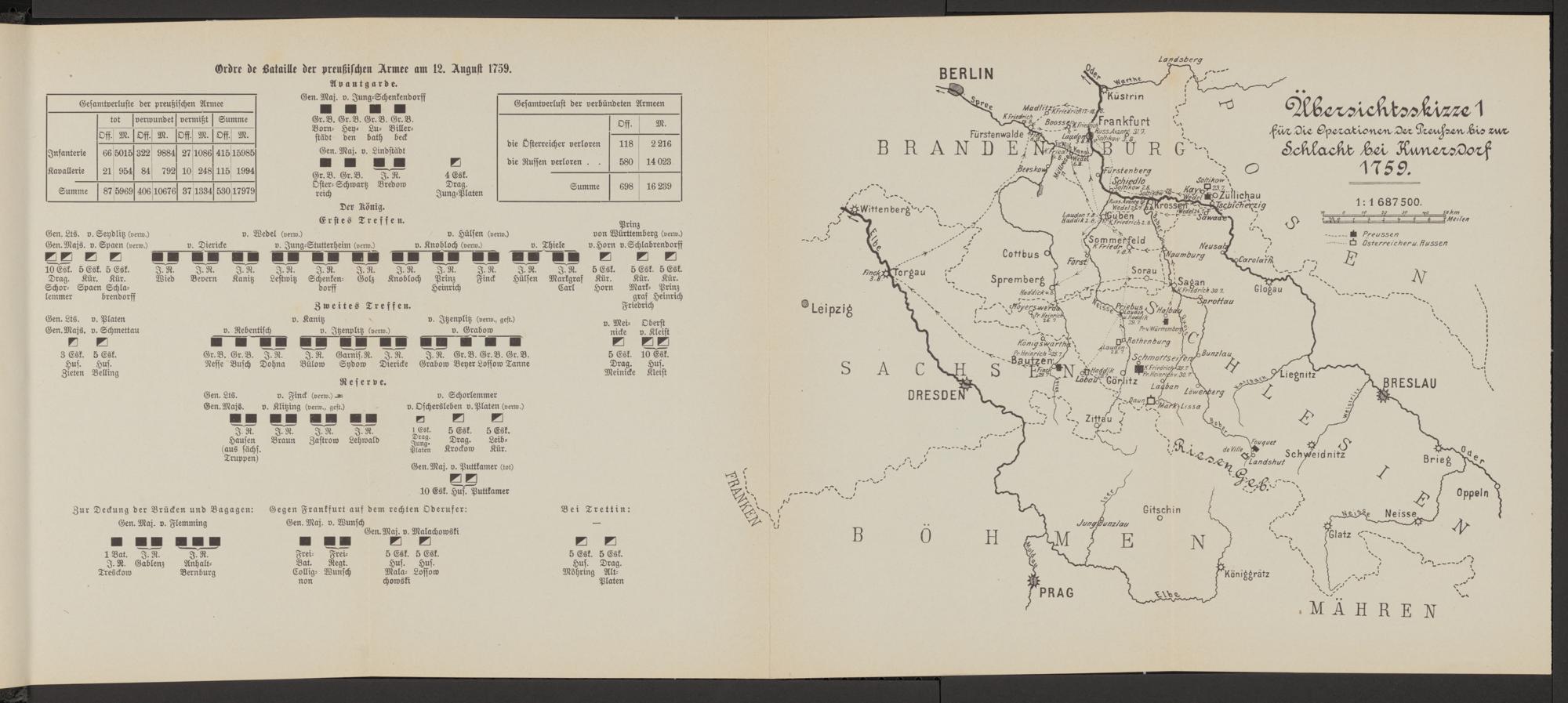 Ordre de Bataille der preußischen Armee am 12. August 1759. Übersichtsskizze 1 für...