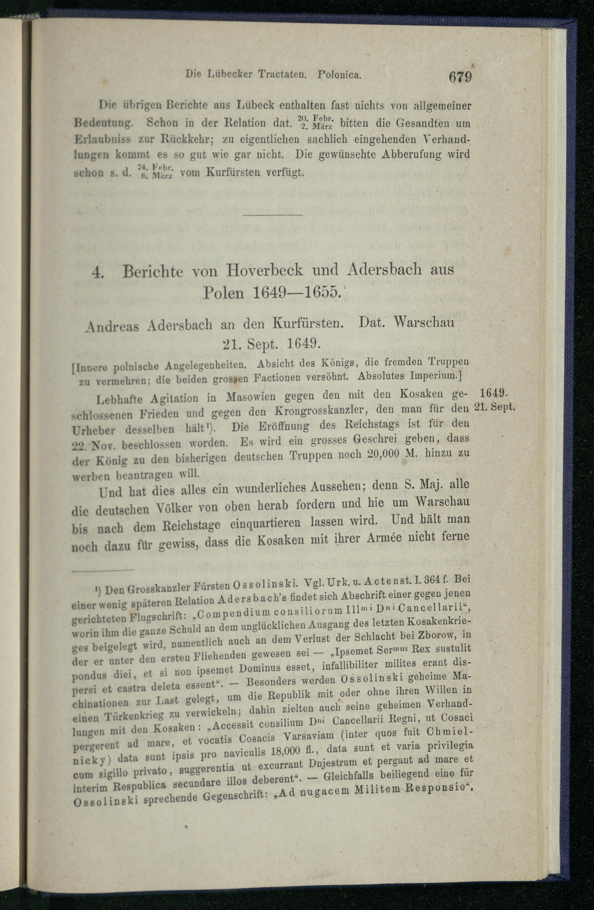 4. Berichte von Hoverbeck und Adersbach aus Polen 1649 - 1655.