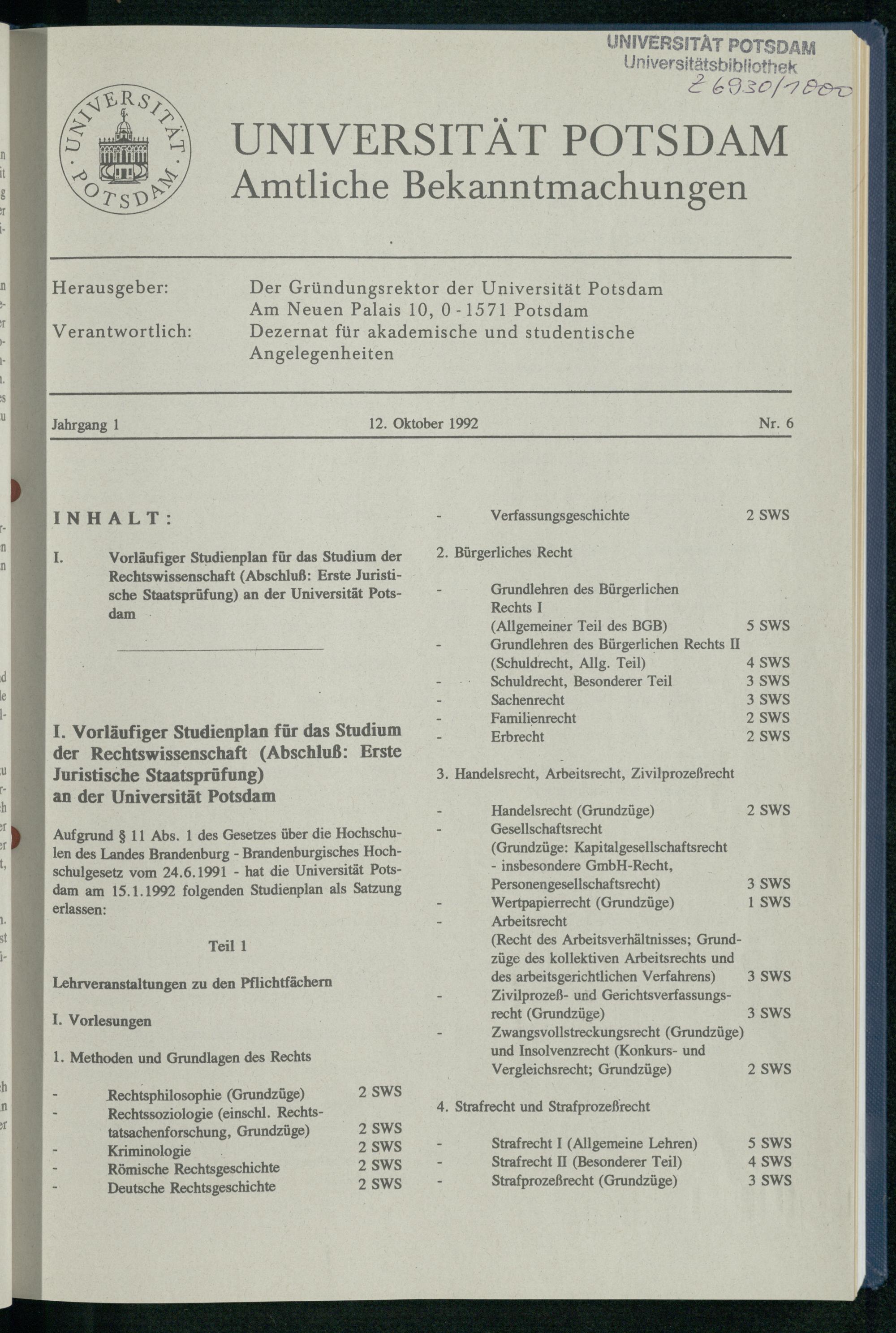 I. Vorläufiger Studienplan für das Studium der Rechtswissenschaft (Abschluß: Erste Juristische Staatsprüfung) an der Universität Potsdam