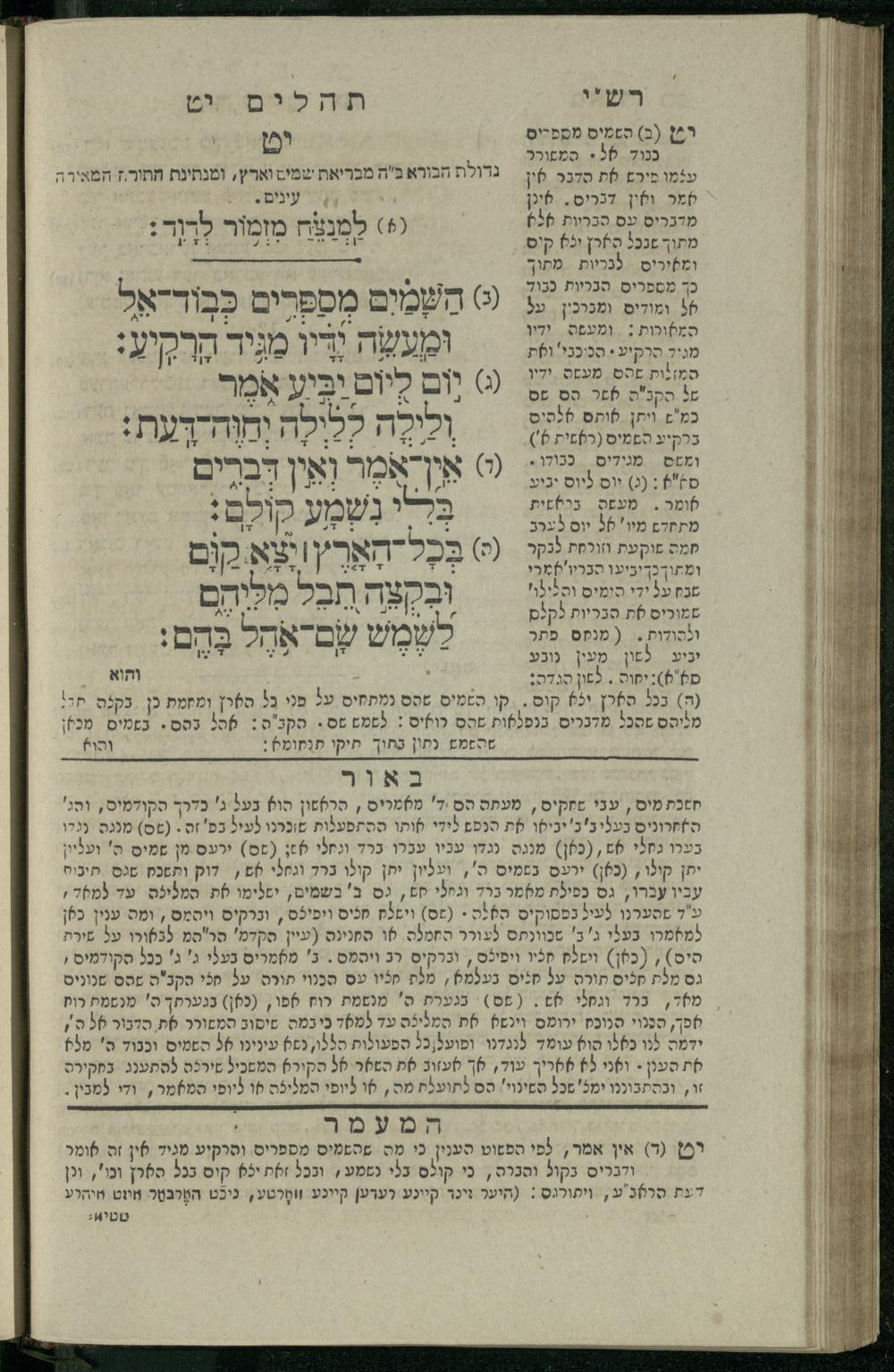 14 (1835) Sefer Tehilim : ʿim Perush Rashi ṿe-targum Ashkenazi me-et Rabenu Mosheh ben Menaḥem n.ʿE., u-veʾur me-et ha-ḥakham ha-mefursam R. Yoʾel Bril asher ḳara be-shem Zemirot Yiśraʾel, ṿe-nilṿeh elaṿ ha-Maʿamar me-et ha-ḥakham ha-medaḳdeḳ mo.h. Ṿolf Meʾir (moreh lashon ʿIvri be-vet ḥinukh ha-normali asher be-Prag), u-ve-tokho nikhlal haʿtaḳah u-veʾur le-khol milot be-laʿaz ha-nimtsaʾot be-Fe. Rashi z.l. / me-et ha-madpis Mosheh ha-Leṿi Landa14 (1835) ספר תהלים / עם פירוש רש״י ותרגום אשכנזי מאת רבינו משה בן מנחם נ״ע, ובאור מאת החכם המפורסם ר' יואל ברי״ל אשר קרא בשם זמירות ישראל, ונלוה אליו המעמר מאת החכם המדקדק מו״ה וואלף מאיר (מורה לשון עברי בבית חנוך הנארמאלי אשר בפראג), ובתוכו נכלל העתקה ובאור לכל מלות בלע״ז הנמצאות בפירש״י ז״ל מאת המדפיס משה הלוי לנדא