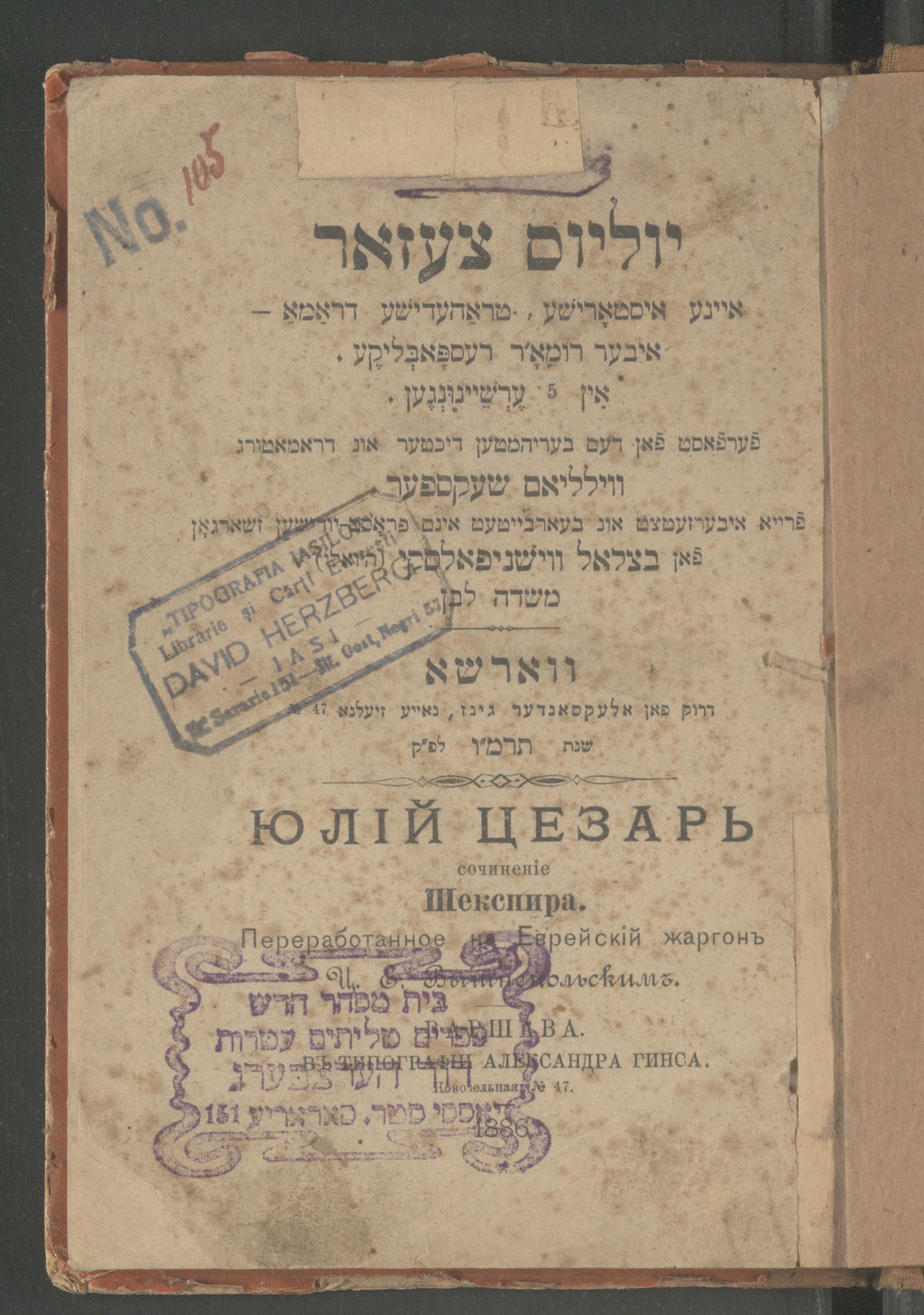 Yulyus Tsezar : eyne isṭorishe ṭrahedishe drama : iber Romaʹr respobliḳe in 5 ershaynungen / ferfasṭ fon dem berihmṭen dikhṭer un dramaṭurg Ṿillyam Sheḳsper ; fray iberzeṭsṭ un bearbeyṭeṭ ins prost yudishen zshargon fon Betsalʾel Ṿishnipolsḳiיוליוס צעזאר : איינע איסטארישע, טראהעדישע דראמא : איבער רומאʹר רעספאבליקע אין 5 ערשיינונגען / פערפאסט פאן דעם בעריהמטען דיכטער אונ דראמאטורג ווילליאם שעקספער ; פרייא איבערזעטצט אונ בעארבייטעט אינס פראסט יודישען זשארגאן פאן בצלאל ווישניפאלסקי