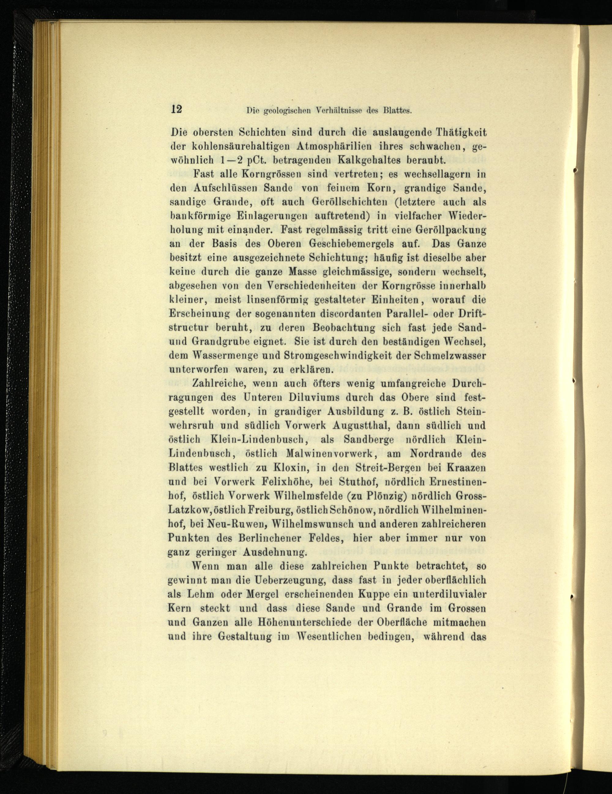 Zahlreiche, wenn auch öfters wenig umfangreiche Durch- ragungen des Unteren Diluviums durch das Obere sind festgestellt worden, in grandiger Ausbildung z. B. östlich Stein- wehrsruh und südlich Vorwerk Augustthal, dann südlich und östlich Klein-Lindenbusch, als Sandberge nördlich Klein- Lindenbusch, östlich Malwinen Vorwerk, am Nordrande des Blattes westlich zu Kloxin, in den Streit-Bergen bei Kraazen und bei Vorwerk Felixhöhe, bei Stuthof, nördlich Ernestinenhof, östlich Vorwerk Wilhelmsfelde (zu Plönzig) nördlich Gross- Latzkow,östlich Freiburg , östlich Schönow, nördlich Wilhelminen- hof, bei Neu-Ruwen, Wilhelmswunsch und anderen zahlreicheren Punkten des Berlinchener Feldes, hier aber immer nur von ganz geringer Ausdehnung.