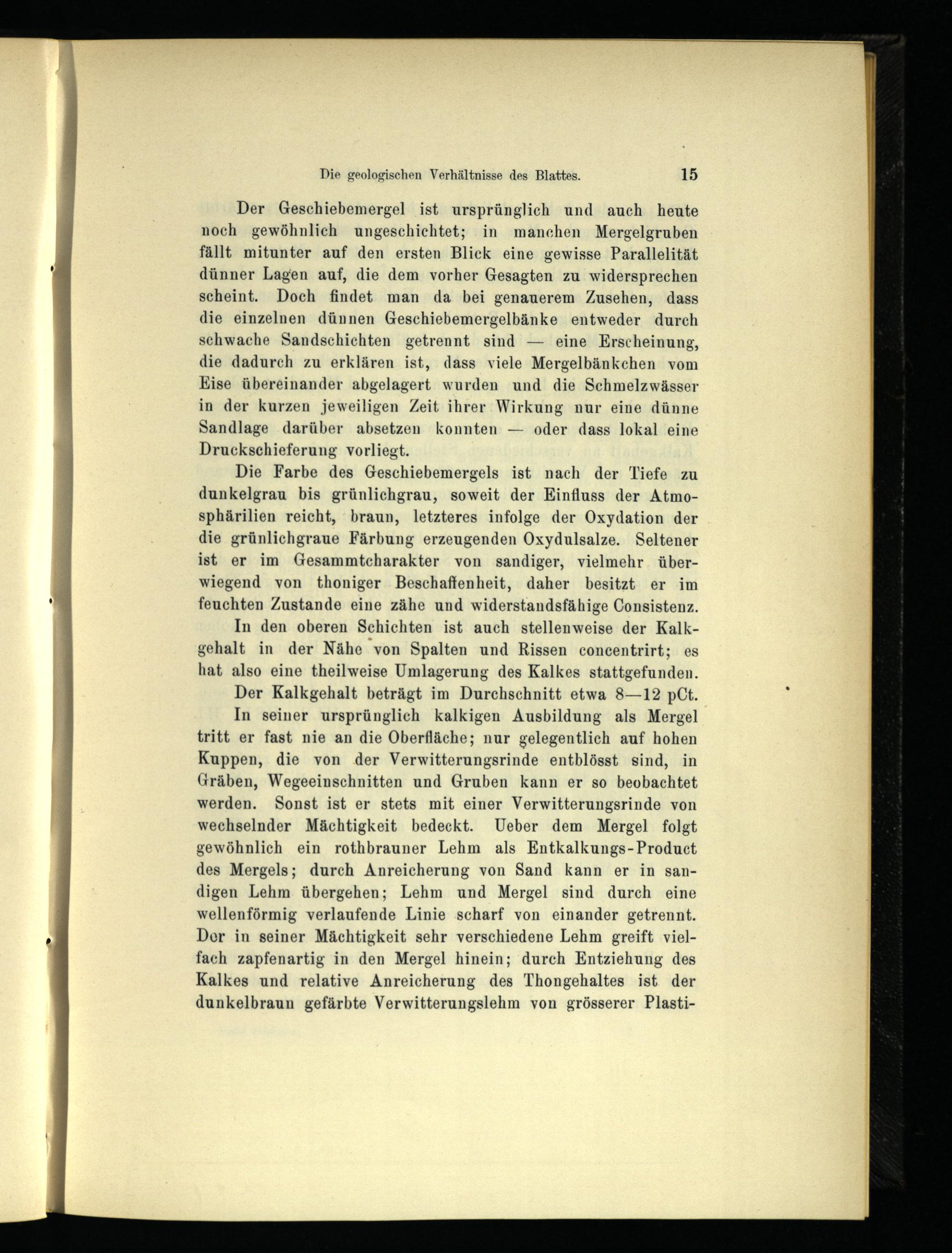 Die Farbe des Geschiebemergels ist nach der Tiefe zu dunkelgrau bis grünlichgrau, soweit der Einfluss der Atmosphärilien reicht, braun, letzteres infolge der Oxydation der die grünlichgraue Färbung erzeugenden Oxydulsalze. Seltener ist er im Gesammtcharakter von sandiger, vielmehr überwiegend von thoniger Beschaffenheit, daher besitzt er im feuchten Zustande eine zähe und widerstandsfähige Consistenz.