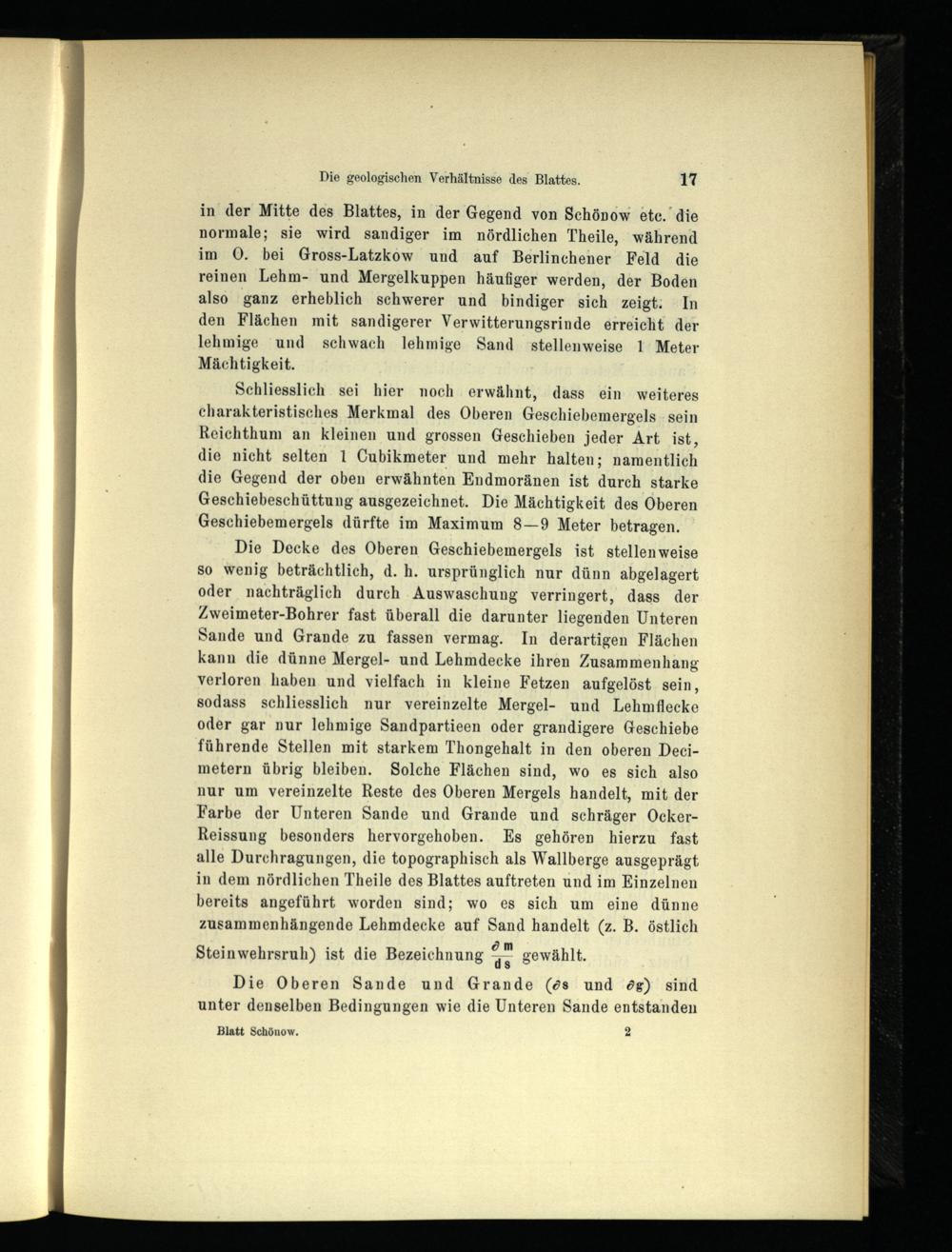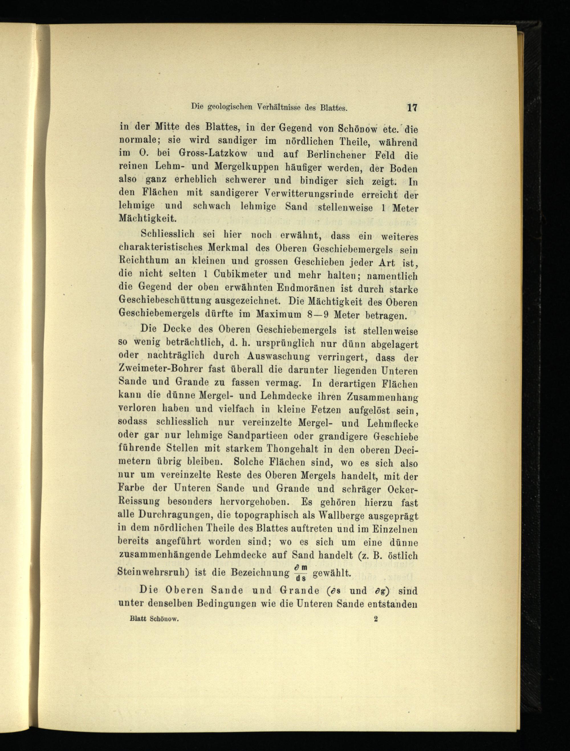 in der Mitte des Blattes, in der Gegend von Schönow etc. die normale; sie wird sandiger im nördlichen Theile, während im 0. bei Gross-Latzkow und auf Berlinchener Feld die reinen Lehm- und Mergelkuppen häufiger werden, der Boden also ganz erheblich schwerer und bindiger sich zeigt. In den Flächen mit sandigerer Verwitterungsrinde erreicht der lehmige und schwach lehmige Sand stellenweise 1 Meter Mächtigkeit.