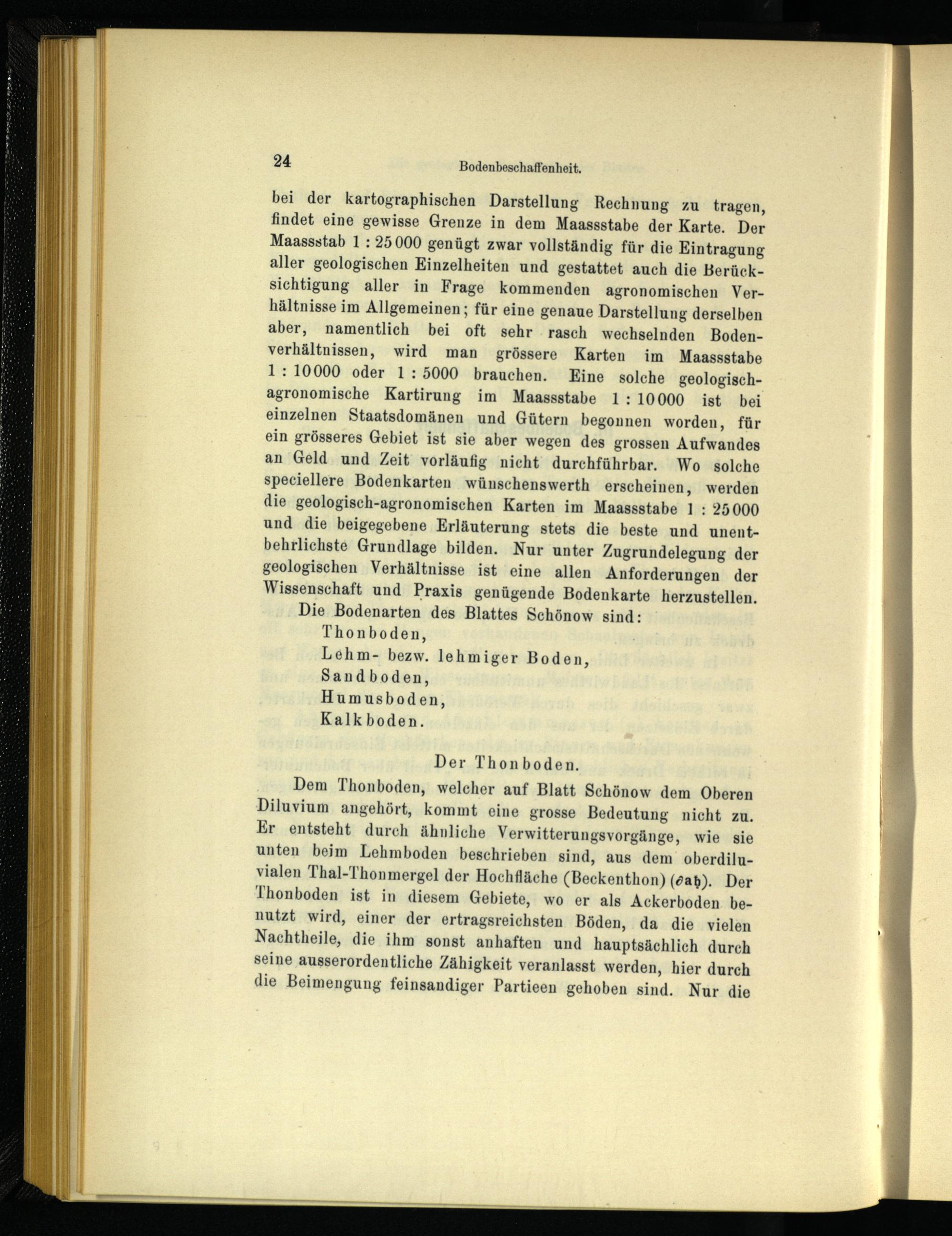 Dem Thonboden, welcher auf Blatt Schönow dem Oberen Diluvium angehört, kommt eine grosse Bedeutung nicht zu. Er entsteht durch ähnliche Verwitterungsvorgänge, wie sie unten beim Lehmboden beschrieben sind, aus dem oberdiluvialen Thal-Thonmergel der Hochfläche (Beckenthon) (^a^). Der Thonboden ist in diesem Gebiete, wo er als Ackerboden benutzt wird, einer der ertragsreichsten Böden, da die vielen Nachtheile, die ihm sonst anhaften und hauptsächlich durch seine ausserordentliche Zähigkeit veranlasst werden, hier durch die Beimengung feinsandiger Partieen gehoben sind. Nur die