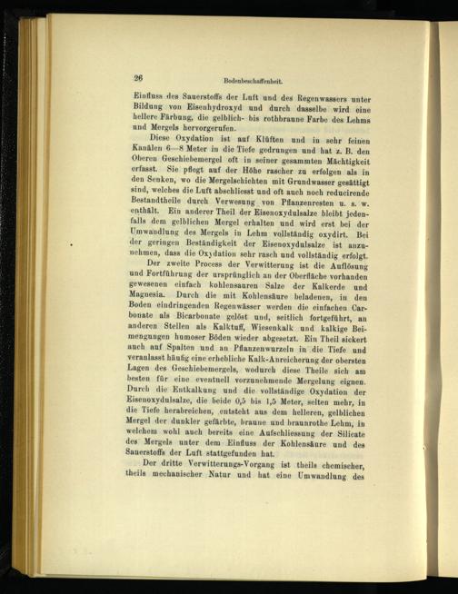 Boden eindringenden Regenwässer werden die einfachen Car- bonate als Bicarbonate gelöst und, seitlich fortgeführt, an anderen Stellen als Kalktuff, Wiesenkalk und kalkige Beimengungen humoser Böden wieder abgesetzt. Ein Theil sickert auch auf Spalten und an Pflanzenwurzeln in die Tiefe und veranlasst häufig eine erhebliche Kalk-Anreicherung der obersten Lagen des Geschiebemergels, wodurch diese Theile sich am besten für eine eventuell vorzunehmende Mergelung eignen. Durch die Entkalkung und die vollständige Oxydation der Eisenoxydulsalze, die beide 0,5 bis 1,5 Meter, selten mehr, in die Tiefe herabreichen, entsteht aus dem helleren, gelblichen Mergel der dunkler gefärbte, braune und braunrothe Lehm, in welchem wohl auch bereits eine Aufschliessung der Silicate des Mergels unter dem Einfluss der Kohlensäure und des Sauerstoffs der Luft stattgefunden hat.