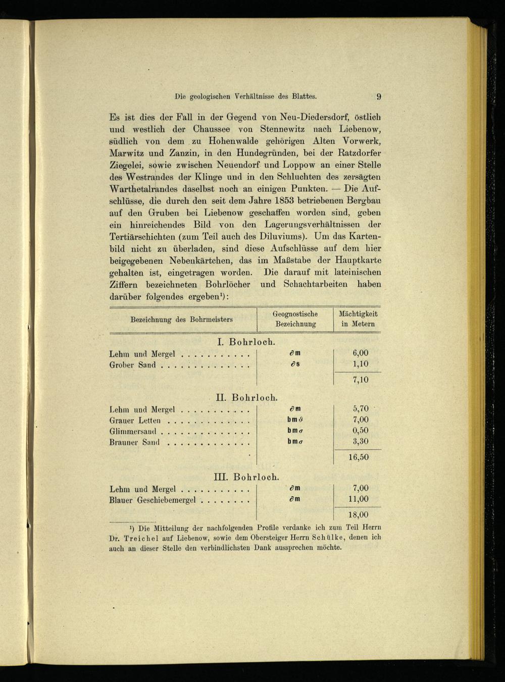 Es ist dies der Fall in der Gegend von Neu-Diedersdorf, östlich und westlich der Chaussee von Stennewitz nach Liebenow, südlich von dem zu Hohenwalde gehörigen Alten Vorwerk, Marwitz und Zanzin, in den Hundegründen, bei der Ratzdorfer Ziegelei, sowie zwischen Neuendorf und Loppow an einer Stelle des Westrandes der Klinge und in den Schluchten des zersägten Warthetalrandes daselbst noch an einigen Punkten. — Die Aufschlüsse, die durch den seit dem Jahre 1853 betriebenen Bergbau auf den Gruben bei Liebenow geschaffen worden sind, geben ein hinreichendes Bild von den Lagerungsverhältnissen der Tertiärschichten (zum Teil auch des Diluviums). Um das Kartenbild nicht zu überladen, sind diese Aufschlüsse auf dem hier beigegebenen Nebenkärtchen, das im Maßstabe der Hauptkarte gehalten ist, eingetragen worden. Die darauf mit lateinischen Ziffern bezeichneten Bohrlöcher und Schachtarbeiten haben darüber folgendes ergeben 1 ):