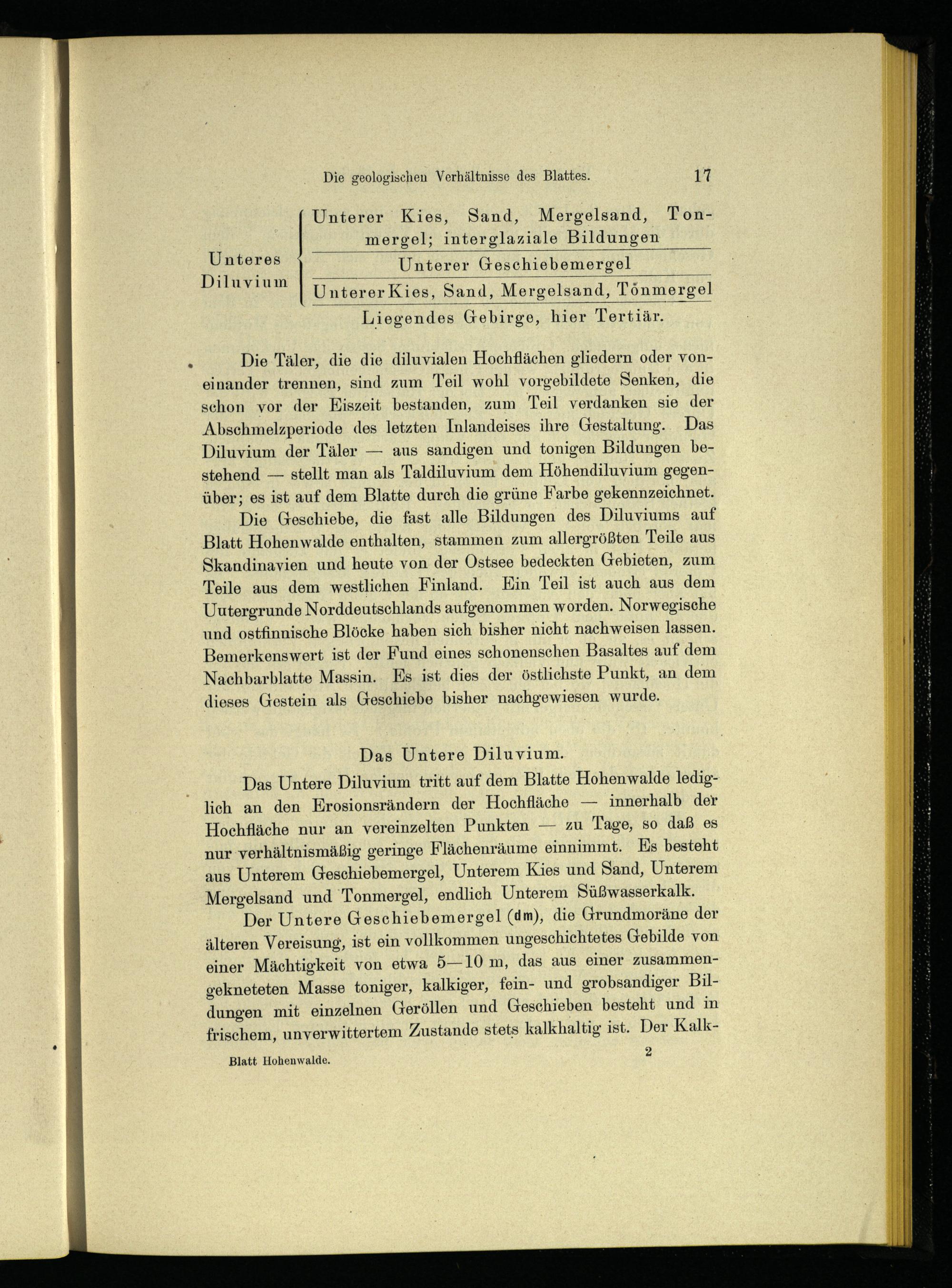 Das Untere Diluvium tritt auf dem Blatte Hohenwalde lediglich an den Erosionsrändern der Hochfläche — innerhalb der Hochfläche nur an vereinzelten Punkten — zu Tage, so daß es nur verhältnismäßig geringe Flächenräume einnimmt. Es besteht aus Unterem Geschiebemergel, Unterem Kies und Sand, Unterem Mergelsand und Tonmergel, endlich Unterem Süßwasserkalk.