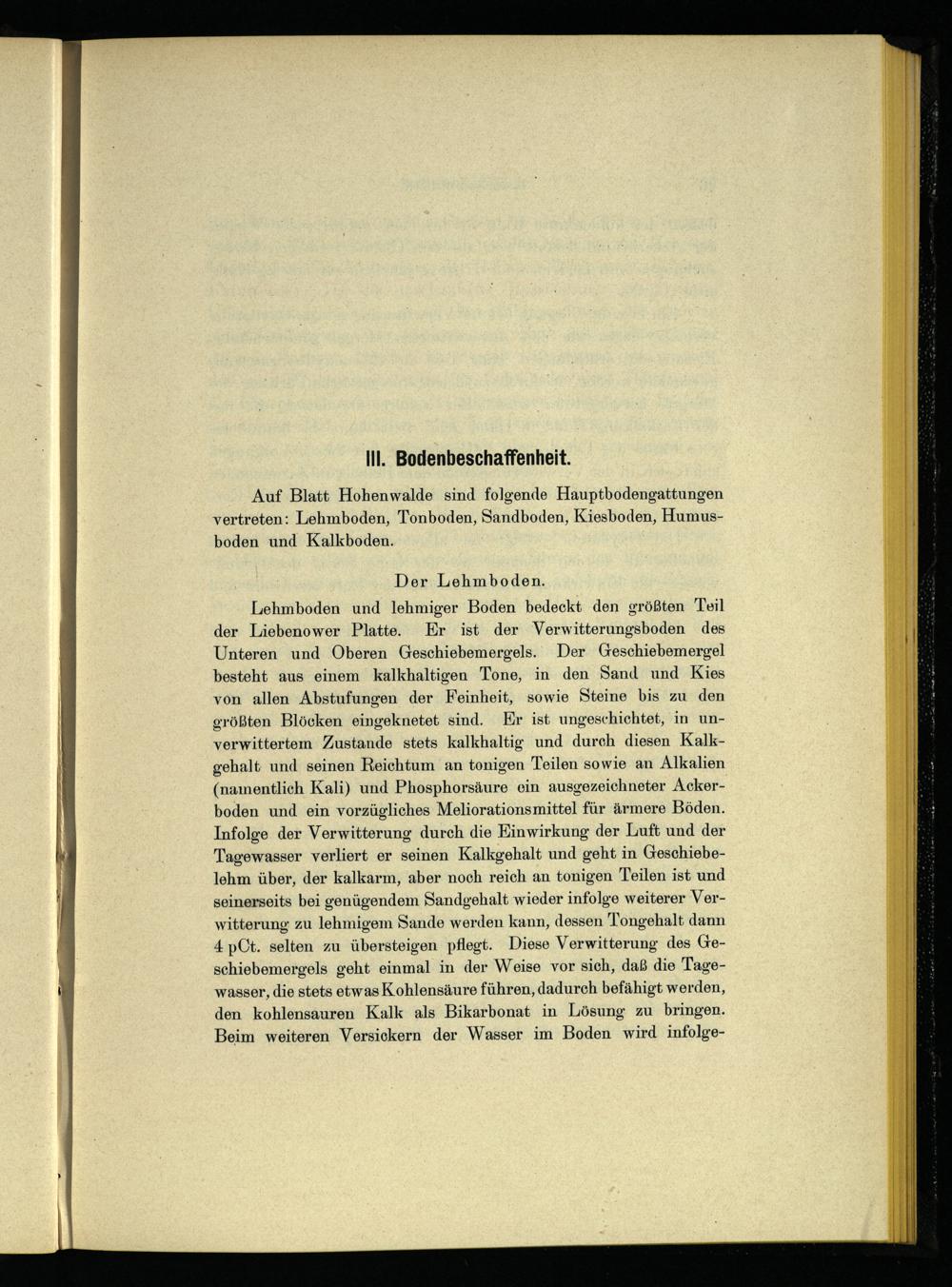 Lehmboden und lehmiger Boden bedeckt den größten Teil der Liebenower Platte. Er ist der Verwitterungsboden des Unteren und Oberen Geschiebemergels. Der Geschiebemergel besteht aus einem kalkhaltigen Tone, in den Sand und Kies von allen Abstufungen der Feinheit, sowie Steine bis zu den größten Blöcken eingeknetet sind. Er ist ungeschichtet, in unverwittertem Zustande stets kalkhaltig und durch diesen Kalkgehalt und seinen Reichtum an tonigen Teilen sowie an Alkalien (namentlich Kali ) und Phosphorsäure ein ausgezeichneter Ackerboden und ein vorzügliches Meliorationsmittel für ärmere Böden. Infolge der Verwitterung durch die Einwirkung der Luft und der Tagewasser verliert er seinen Kalkgehalt und geht in Geschiebelehm über, der kalkarm, aber noch reich an tonigen Teilen ist und seinerseits bei genügendem Sandgehalt wieder infolge weiterer Verwitterung zu lehmigem Sande werden kann, dessen Tongehalt dann 4 pCt. selten zu übersteigen pflegt. Diese Verwitterung des Geschiebemergels geht einmal in der Weise vor sich, daß die Tagewasser, die stets etwas Kohlensäure führen, dadurch befähigt werden, den kohlensauren Kalk als Bikarbonat in Lösung zu bringen. Beim weiteren Versickern der Wasser im Boden wird infolge-