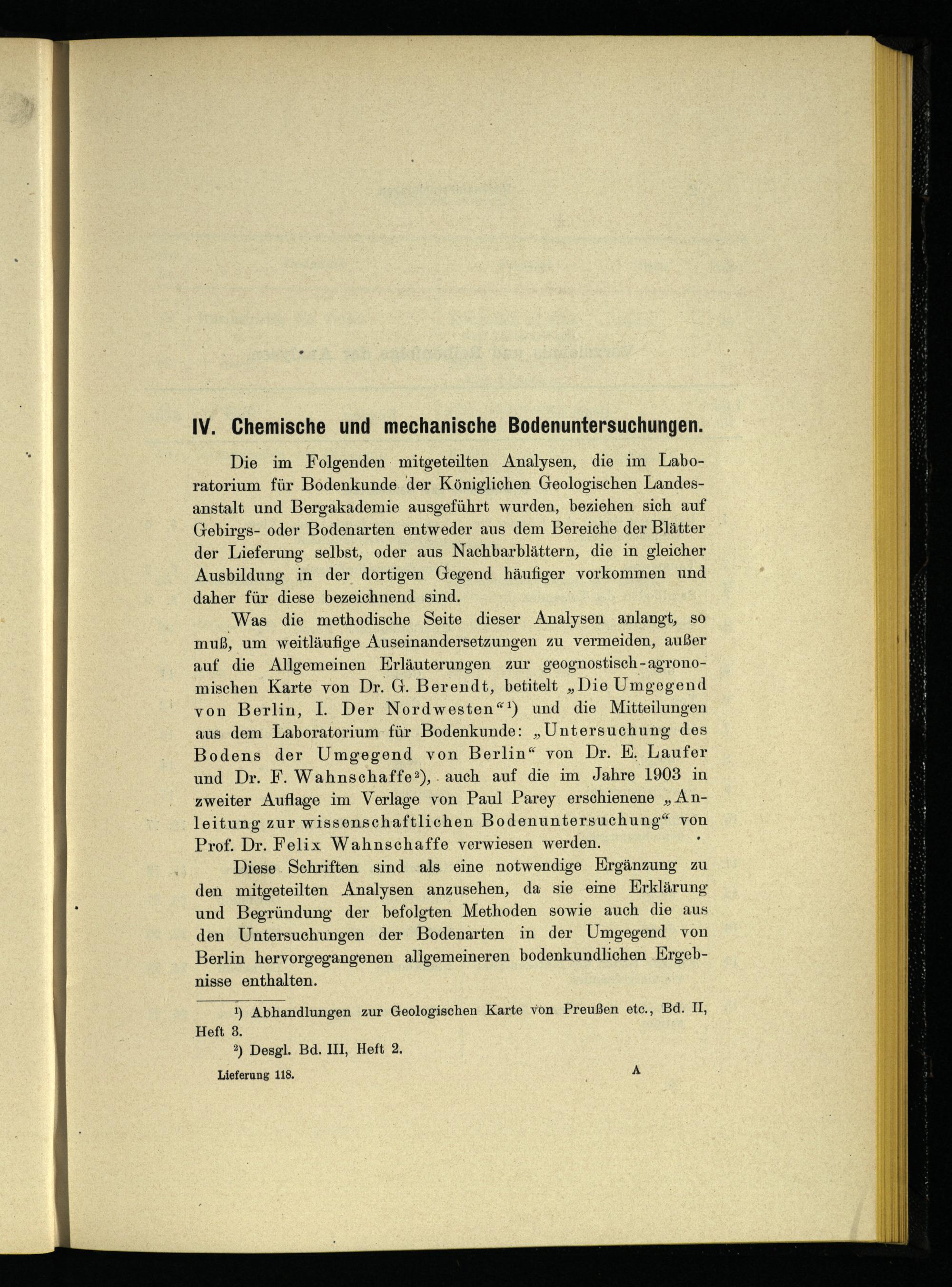 Diese Schriften sind als eine notwendige Ergänzung zu den mitgeteilten Analysen anzusehen, da sie eine Erklärung und Begründung der befolgten Methoden sowie auch die aus den Untersuchungen der Bodenarten in der Umgegend von Berlin hervorgegangenen allgemeineren bodenkundlichen Ergebnisse enthalten.
