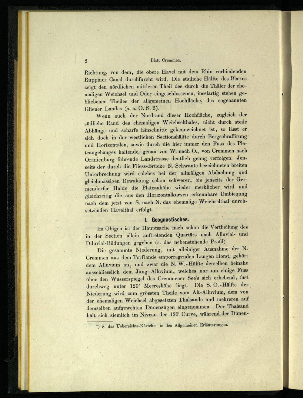 Wenn auch der Nordrand dieser Hochfläche, zugleich der südliche Rand des ehemaligen Weichselthales, nicht durch steile Abhänge und scharfe Einschnitte gekennzeichnet ist, so lässt er sich doch in der westlichen Sectionshälfte durch Bergschraffirung und Horizontalen, sowie durch die hier immer den Fuss des Plateaugehänges haltende, genau von W. nach O., von Cremmen nach Oranienburg führende Landstrasse deutlich genug verfolgen. Jenseits der durch die Fliess-Brücke N. Schwante bezeichneten breiten Unterbrechung wird solches bei der allmäligen Abdachung und gleichmässigen Bewaldung schon schwerer, bis jenseits der Germendorfer Haide die Plateauhöhe wieder merklicher wird und gleichzeitig die aus den Horizontalkurven erkennbare Umbiegung nach dem jetzt von S. nach N. das ehemalige Weichselthal durchsetzenden Havelthal erfolgt.