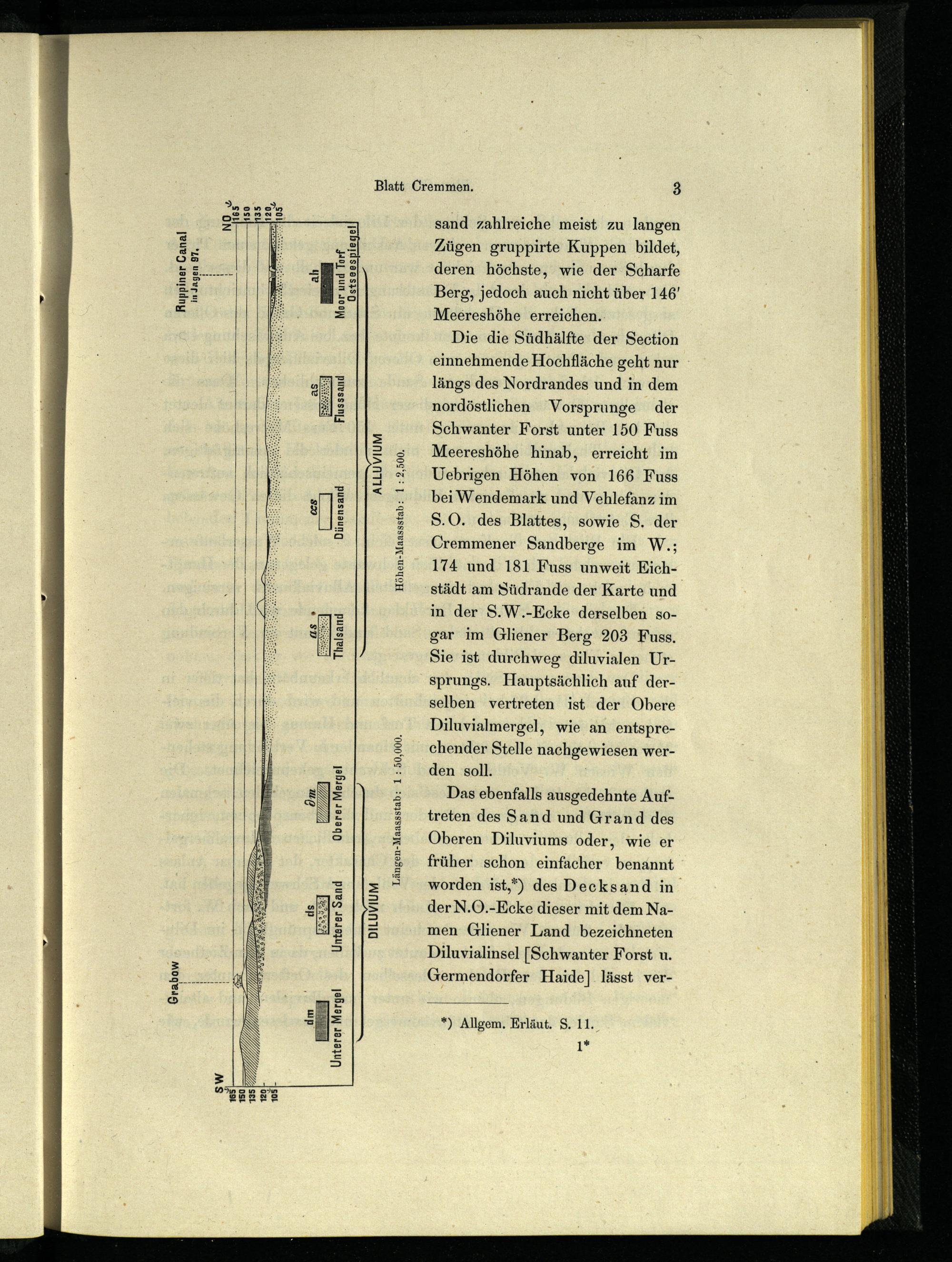 Die die Südhälfte der Section einnehmende Hochfläche geht nur längs des Nordrandes und in dem nordöstlichen Vorsprunge der Schwanter Forst unter 150 Fuss Meereshöhe hinab, erreicht im Uebrigen Höhen von 166 Fuss bei Wendemark und Vehlefanz im S. O. des Blattes, sowie S. der Cremmener Sandberge im W.; 174 und 181 Fuss unweit Eichstädt am Südrande der Karte und in der S.W.-Ecke derselben sogar im Gliener Berg 203 Fuss. Sie ist durchweg diluvialen Ursprungs. Hauptsächlich auf derselben vertreten ist der Obere Diluvialmergel, wie an entsprechender Stelle nachgewiesen werden soll.