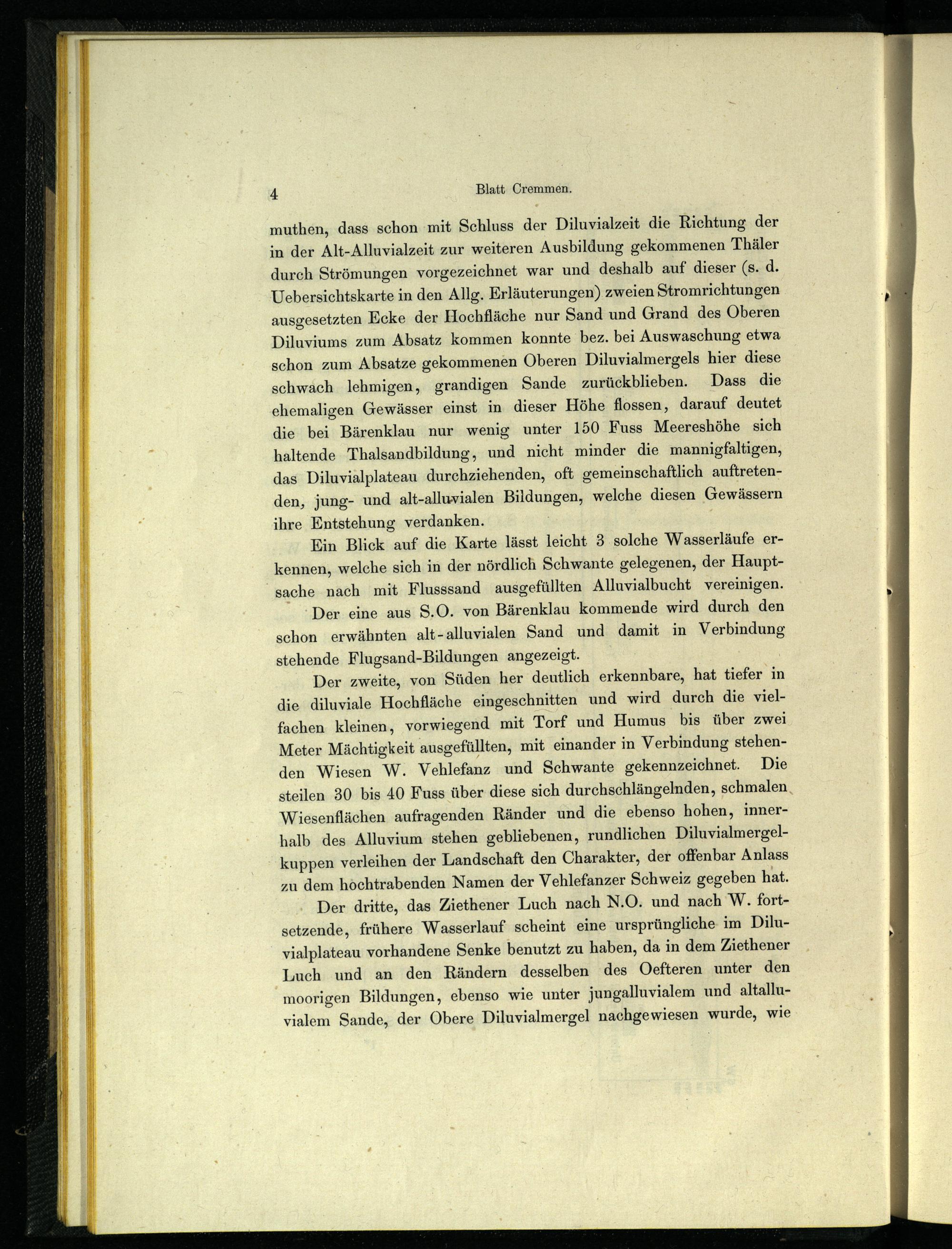 muthen, dass schon mit Schluss der Diluvialzeit die Richtung der in der Alt-Alluvialzeit zur weiteren Ausbildung gekommenen Thäler durch Strömungen vorgezeichnet war und deshalb auf dieser (s. d. Uebersichtskarte in den Allg. Erläuterungen) zweien Stromrichtungen ausgesetzten Ecke der Hochfläche nur Sand und Grand des Oberen Diluviums zum Absatz kommen konnte bez. bei Auswaschung etwa schon zum Absätze gekommenen Oberen Diluvialmergels hier diese schwach lehmigen, grandigen Sande zurückblieben. Dass die ehemaligen Gewässer einst in dieser Höhe flössen, darauf deutet die bei Bärenklau nur wenig unter 150 Fuss Meereshöhe sich haltende Thalsandbildung, und nicht minder die mannigfaltigen, das Diluvialplateau durchziehenden, oft gemeinschaftlich auftretenden, jung- und alt-alluvialen Bildungen, welche diesen Gewässern ihre Entstehung verdanken.