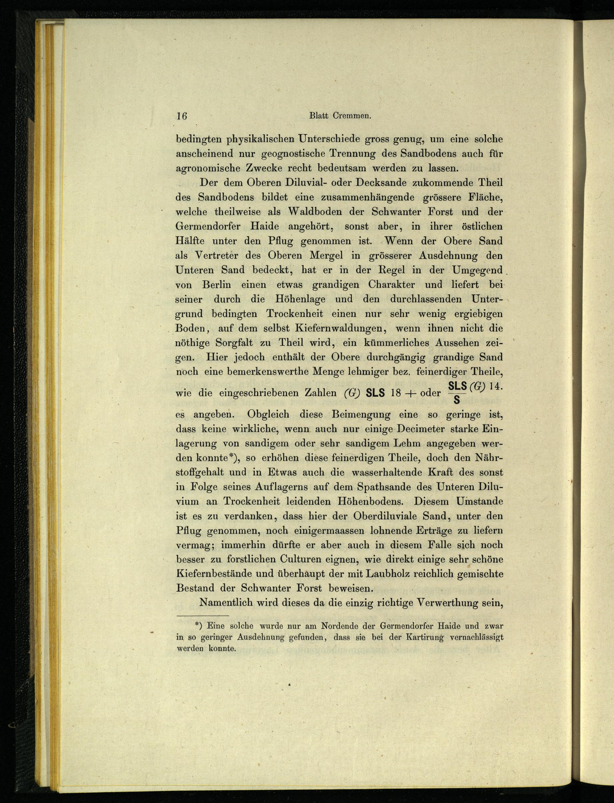 Der dem Oberen Diluvial- oder Decksande zukommende Theil des Sandbodens bildet eine zusammenhängende grössere Fläche, welche theilweise als Waldboden der Schwanter Forst und der Germendorfer Haide angehört, sonst aber, in ihrer östlichen Hälfte unter den Pflug genommen ist. Wenn der Obere Sand als Vertreter des Oberen Mergel in grösserer Ausdehnung den Unteren Sand bedeckt, hat er in der Regel in der Umgegend . von Berlin einen etwas grandigen Charakter und liefert bei seiner durch die Höhenlage und den durchlassenden Untergrund bedingten Trockenheit einen nur sehr wenig ergiebigen Boden, auf dem selbst Kiefern Waldungen, wenn ihnen nicht die nöthige Sorgfalt zu Theil wird, ein kümmerliches Aussehen zeigen. Hier jedoch enthält der Obere durchgängig grandige Sand noch eine bemerkenswerthe Menge lehmiger bez. feinerdiger Theile,