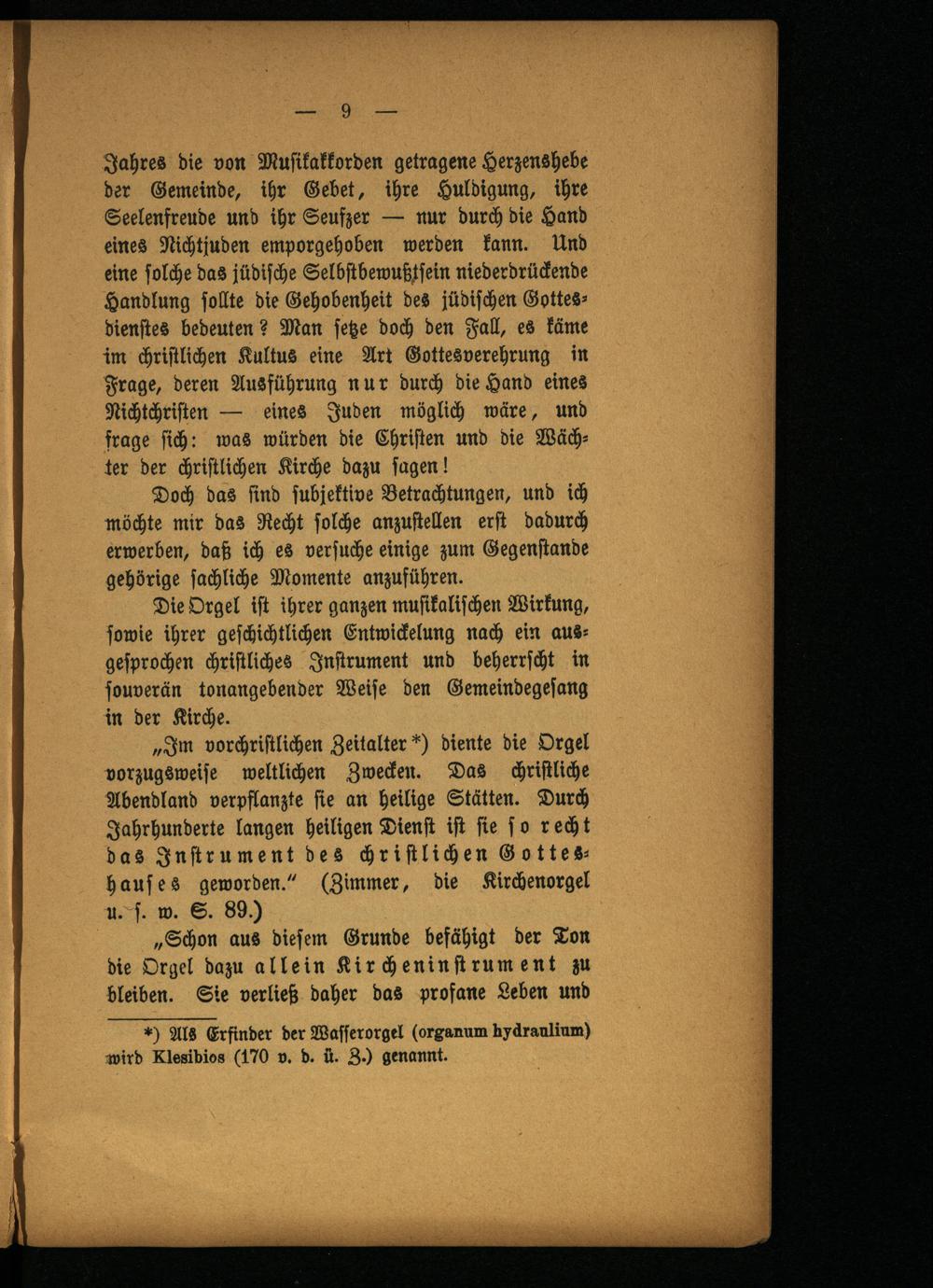 „Im vorchristlichen Zeitalter *) diente die Orgel vorzugsweise weltlichen Zwecken. Das christliche Abendland verpflanzte sie an heilige Stätten. Durch Jahrhunderte langen heiligen Dienst ist sie so recht das Instrument des christlichen Gotteshauses geworden." (Zimmer, die Kirchenorgel u. s. w. S. 89.)