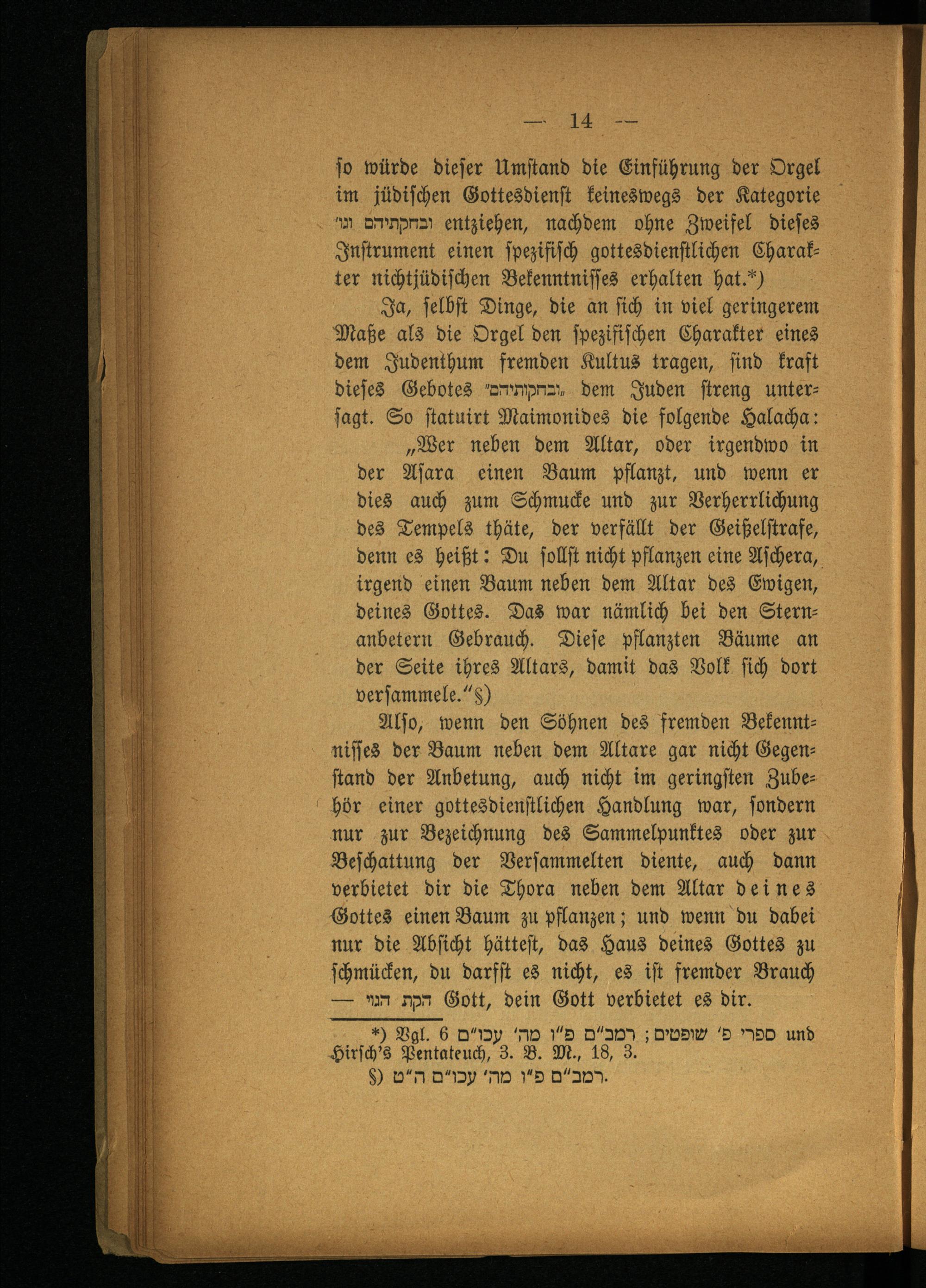 Ja, selbst Dinge, die an sich in viel geringerem Maße als die Orgel den spezifischen Charakter eines dem Judenthum fremden Kultus tragen, sind kraft dieses Gebotes "on'ivpnvi. dem Juden streng untersagt. So statuirt Maimonides die folgende Halacha: „Wer neben dem Altar, oder irgendwo in der Asara einen Baum pflanzt, und wenn er dies auch zum Schmucke und zur Verherrlichung des Tempels thäte, der verfällt der Geißelstrafe, denn es heißt: Du sollst nicht pflanzen eine Aschera, irgend einen Baum neben dem Altar des Ewigen, deines Gottes. Das war nämlich bei den Sternanbetern Gebrauch. Diese pflanzten Bäume an der Seite ihres Altars, damit das Volk sich dort versammele."^)