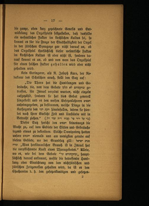 die ganze, oben kurz gezeichnete Genesis und Entwickelung des Orgelspiels festzustellen, daß dasselbe ein wesentlicher Faktor im kirchlichen Kultus sei, so kommt es für die Frage der Statthaftigkeit der Orgel in der jüdischen Synagoge gar nicht darauf an, ob das Orgelspiel thatsächlich dieser wesentliche Faktor im kirchlichen Kultus ist oder nicht ist, sondern darauf kommt es an, ob und von wem das Orgelspiel für einen solchen Faktor gehalten wird oder nicht gehalten wird.