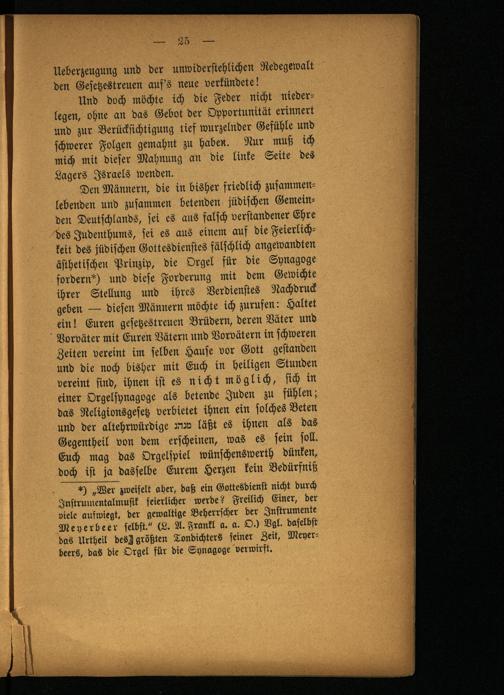 Den Männern, die in bisher friedlich zusammenlebenden und zusammen betenden jüdischen Gemeinden Deutschlands, sei es aus falsch verstandener Ehre 'des Judenthums, sei es aus einem auf die Feierlichkeit des jüdischen Gottesdienstes fälschlich angewandten ästhetischen Prinzip, die Orgel für die Synagoge fordern*) und diese Forderung mit dem Gewichte ihrer Stellung und ihres Verdienstes Nachdruck geben — diesen Männern möchte ich zurufen: Haltet ein! Euren gesetzestreuen Brüdern, deren Väter und Vorväter mit Euren Vätern und Vorvätern in schweren Zeiten vereint im selben Hause vor Gott gestanden und die noch bisher mit Euch in heiligen Stunden vereint sind, ihnen ist es nicht möglich, sich in einer Orgelsynagoge als betende Juden zu fühlen; das Religionsgesetz verbietet ihnen ein solches Beten und der altehrwürdige läßt es ihnen als das Gegentheil von dem erscheinen, was es sein soll. Euch mag das Orgelspiel wünschenswerth dünken, doch ist ja dasselbe Eurem Herzen kein Bedürfniß