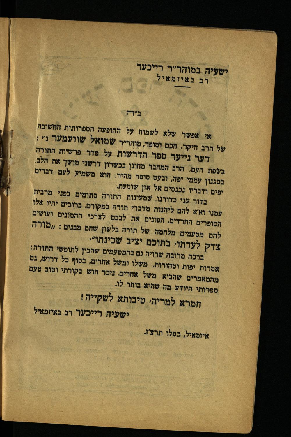 בדור עני כדורנו, שמעינות התורה סתומים בפּני מרבית עמנו וא'א להם ליהנוּת מדברי תורה נמקורם, ברוכים יהיו אלו הסופרים החרדים, הפונים את לנכם לצוכי ההמוֹנים ועושים להם מטעמים מלחמה של תורה בלשון שהם מבנים: /מורה צדק לעדתו. בתוכם יציב שׁכינתו"י