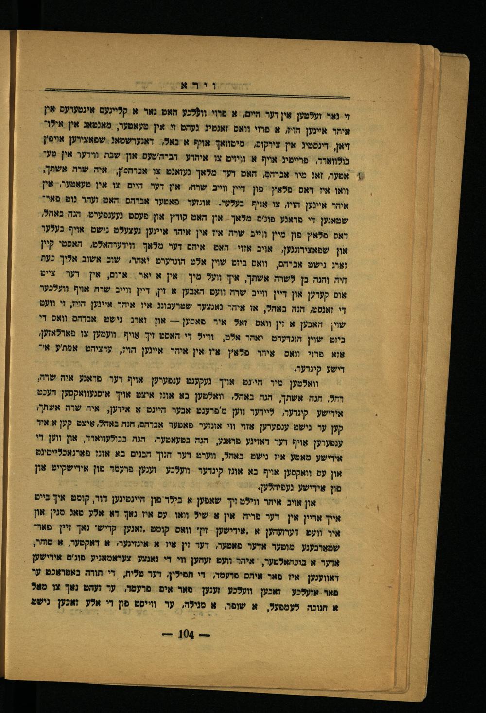 שיו ייר אי: א יי אייירא יי טי אאיאטאואואעאאאי יא זי נאר זעלטען אין דער חיים, א פווי וועלכע האט גאר א קליינֶעם אינטערעס אין איהו איינען הוק א פרוי וואס זאנטיג נעהט זי אין טעאטער, מאנטאג אין אילו" זיאן, דינסטיג אין צירקוסו מיטוואך אויף א-כאל,. דאגערשטאג- שפאצירען אויפ'ן בולווארד, פריימיג אויף א וויזיט צו איהרע. חביה'טעם און. שבת ווידער אין טֶעד, אטער, זאג מין אברהם, האט דער מלאך נעזאנט צו אברהסץ,= איה שרה אשתך, וואו איז דאס פלאיץ. פון דיין ווייב שרה, אין דער חיים צו אין טעאטער,. אין איהו איינען הױיז, צו אויף בעלער.= אונזער= פאטער אכרהם. האט. זעהר נוט. פאר" שטאנען די פראנע פונ'ם מלאך. און האט קודץ און! פעסט. געענפערט, הנה. באהלו דאס פלאץ פון מיין ווייב שרה איז אין איהר איינען נעצעלט נישט. אויף. בעלער און שפאצירוננען, אוב אזוי האט איהם דער מלאך ווידערהאלט, האסטי קיין זאוג נישט אביהם, וואס כיזט שוין אלט הונדערט יאהר. שוב אשוב אליך כעת חיה והנה כן לשרה אשחך, איך װעל מיך= אין א יאר. אוום, אין דער צייט אום קערען און דיין ווייב שרה וועט האבען א זין, דיין ווייב שרה אויף וועלכער די זאנסט, הנה באהל, אז איהר נאנצער שטרעכונג איז איהר אייגען היז, זי ועט שוין האכען א זין וואס זאל איר פאסען-- און זארג נישט אברהם וואס די ניוט שוין הונדערט יאהר אלט, ווייל די האסט זיך אַױף וועמען צו פארלאזען אזא פרױי וואס איחך פלאץ איז אין איהר איינען הױז, ערציהט אמת'ע אידישע קינרער.