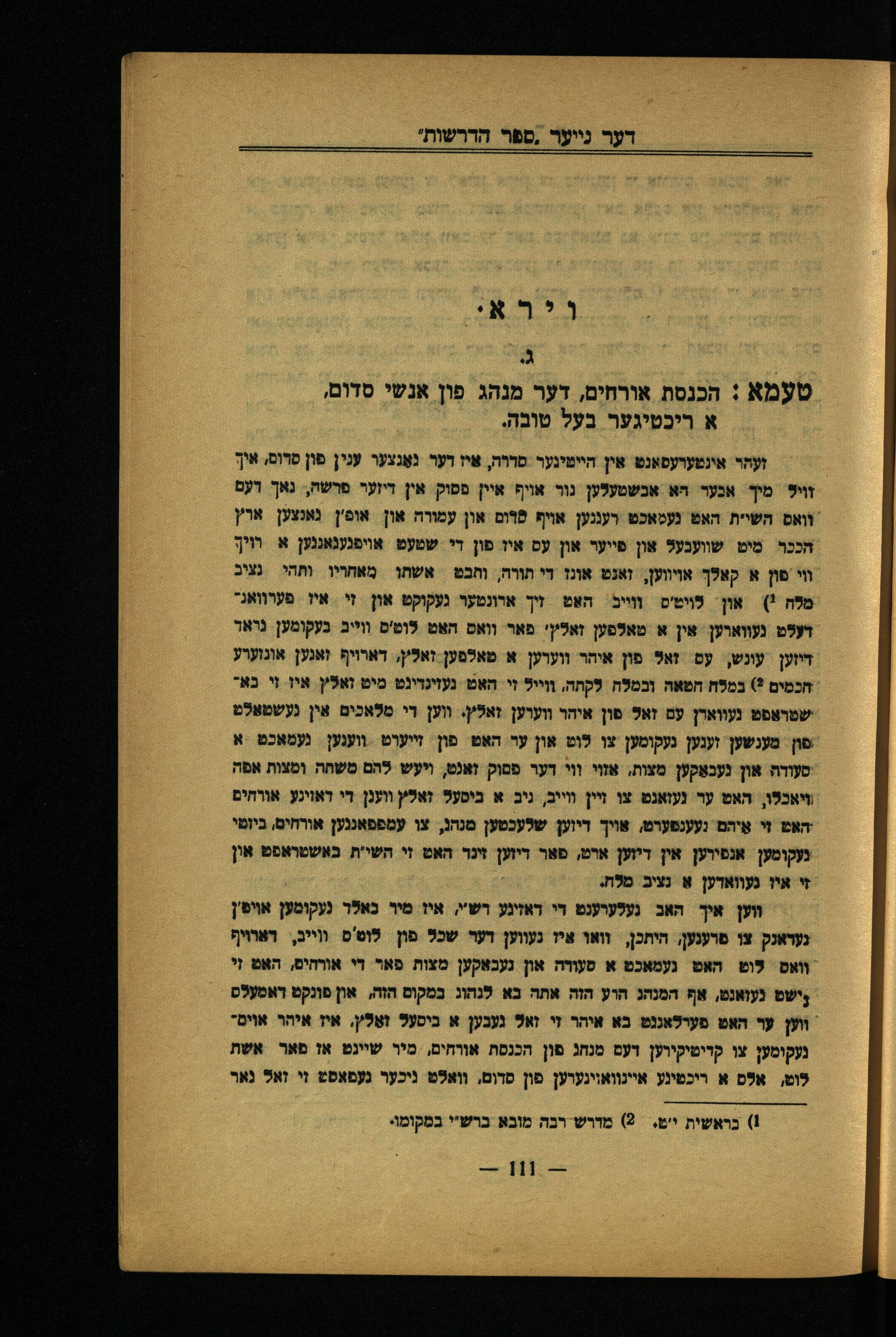 זעהר אינטערעסאנט אין היימינער סדרה, איז דער נאַנצער ענין פון פרום, איך זויל מיך אכער הא אכשטעלען נור אויף איין פסוק. אין דיזער פרשה,. נאך דעם וואםס השיית האט נעמאכט דעננען אויף פֿלום און עמורה און אופ'ן גאנצען ארץ הככר מִיט שוועכעל און פייער און עס איז פון די שטעט אויפגענאננען א רויך וי פון א קאלך אויווען, זאנט אונז די תורה, והבט אשתו מאחריו וַתּהי נציב מלה!) און. לויט'ס ווייב האט זיך ארונטער געקוקט און זי איז פערוואגדעלט נעווארען אין א טאלפען זאליץ' פאר וואס האט לוט'ם ווייב בעקומען נראר דיזען עונש, עס זאל פון איהר ווערען א טאלמען זאלץ, דארויף זאנען אונוערע חכמים?) במלח חטאה וכמלה לקתה, ווייל זי האט נעזינדיגט מיט זאלץ איז זי בא" ישטראפט נעווארן עם זאל פון איהר ווערען זאלץ. ווען די מלאכים אין געשטאלט פון מענשען זענען געקומען צו לוט און ער האט פון זייערט ווענען א סעורה און נענאַקען מצות, אזוי וי דער פמוק זאנט, ויעש להם משחה ומצות אפה ויאכלו, האט ער נעזאנט צו זיין ווייב, גיב א ביסעל זאלץ ווענן די דאוינע אורחים האט זי אֵיהם געענפערט, אויך דיזען שלעכטען מנהג, צו עמפפאנגען אורחים, ביזטי נעקומען. אנפירען אין דיזען ארט, פאר דיזען זינר האט זי השי'ת באשטראפט אין זי איז געווארען א נעיב מלח. ווען איך הא געלערענט די דאזינע רש"י, איז מיר באלר געקומען אויפ'ן נעראנק צו פרענען, היתכן, וואו איז נעווען דער שכל פון לוט'ס ווייב, דארויף וואם לוט האט נץמאכט א מעורה און נעבאקען מצות פאר די אורהים, האט זי נישט געזאנט, אף המנהג הוע הזה אתה בא לנהוג במקום הזה, און פונקט ראמעלס. ווען ער האט פערלאננט כא איהר זי זאל געבען א ביסעל זאַלץ. איז איהר אויםגעקומען צו קדיטיקיוען דעם מנחג פון הכנסת אורחים, מיר שיינט אז פאר אשת לוט, אלס א ריכטינע איינוואוינערען פון סדום, וואלט ניכער געפאסט זי זאל נאר