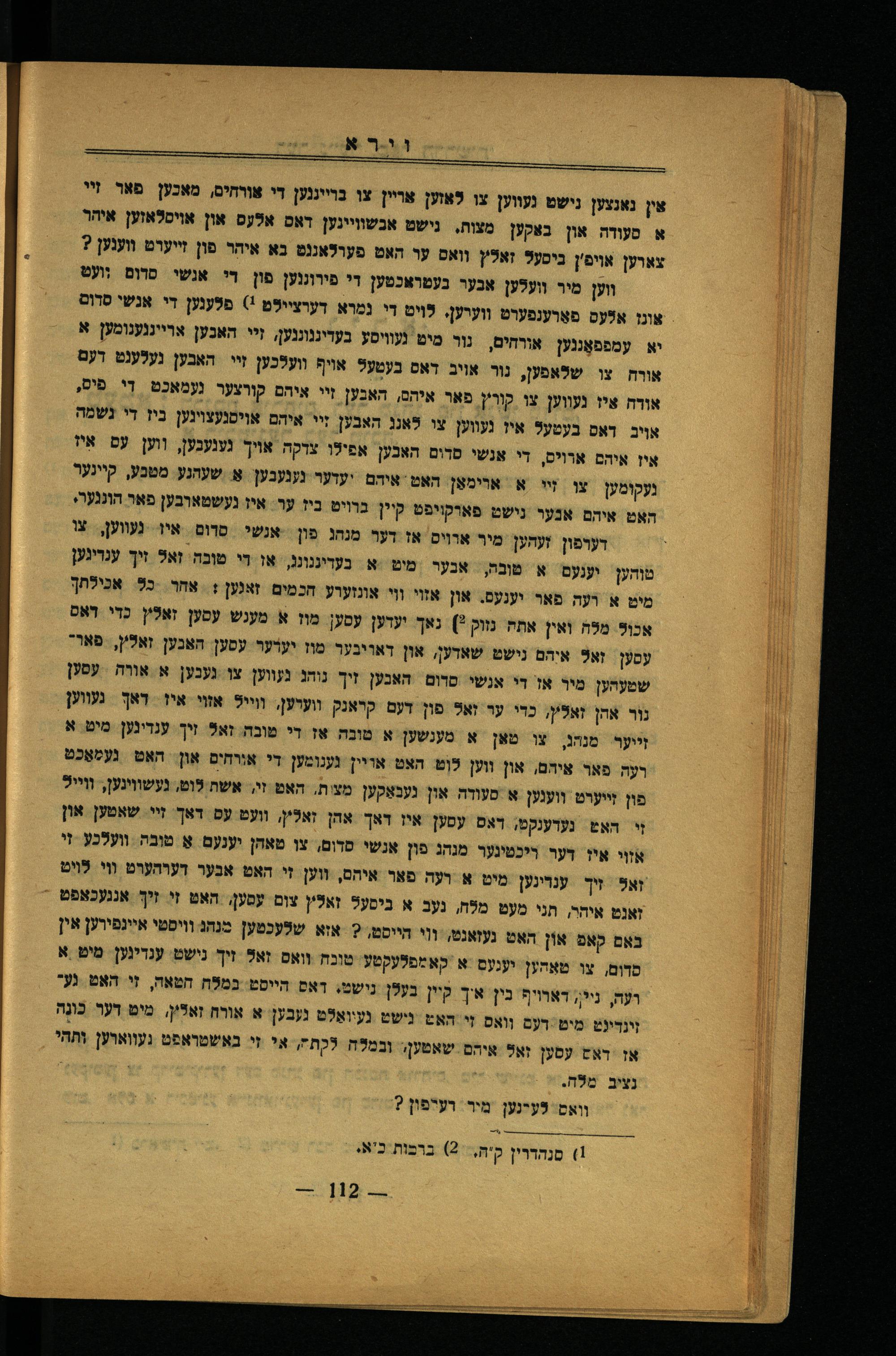 דערפון זעהען. מיר ארויס אז דער מנהג פון אנשי סדום. איו. נעווען, צו טוהען יענעם= א פובת,= א. בעריננונג, או די טובה. זאל זיך ענריגען מיט א ועה פֿאר יענעם. און אזוי וי אונזערע חכמים- כל? אכילתך אכול מלה ואין אתה נזוק?) נאך יעדען עסען מוו א מענש עסען זאלץ כדי האס עסען זאל איהם נישט שאדען, און דאויבער מוז יערער עסען האבען זאליץ, פארשטעהען מיר אז די אנשי סדום האכען זיך נוהג געווען צו געכען א אורה עסען נור אהן זאלץ, כרי ער זאל פון דעם קראנק ווערען. ווייל אזוי איז דאך געווען זייער מנהג, צו טאן א מענשען א טובה אז די מובה. זאל זיך ענדינען מיט א רעה פאר איהם, און ווען לוט האט אויין גענומען די אורחים און האט געמאַכט פון זיערט ווענען א סעודה און געבאַקען מצות. האפ זי, אשת לוט, געשווינען, ווייל זי האט נערענקט, ראס עסען איז דאך אחן זאלץ, וועט עס דאך זי שאטען און אזױי איז דער וינטינער מנהג פון אנשי סדום, צו טאהן יענעם אַ טובה וועלכע זי זאל זיך ענרינען מיט א דעה פאר איהס, ווען זי האט אכער דערהערט וי לױט זאגט איחר, חני מעט מלח, נעב א ניסעל זאליץ צום עפען, האט זי זיך אנגעכאפט באם קאפ אוֹן האט נעזאנטו װי הייסט,? אזא שלעכטען מנהג וויסטי איַנפירען אין פדום, צו טאהען יענעס א קאמפלעקטע טונח וואס זאל זיך נישט. ענדיגען מיט א רעה, ניי, דארויף בין איך קיין בעלן נישט. דאס הייסט. נמלה הטאה, זי האט גע זינדינט מיט דעם וואס זי האט נישט געיואַלט געבען. א אורח זאלץ, מיט דער כּונה או דאס עסען זאל איהם שאטען ובמלה לקתז, אי זי באשטראפט געווארען ותהי נעיב מלה.'
