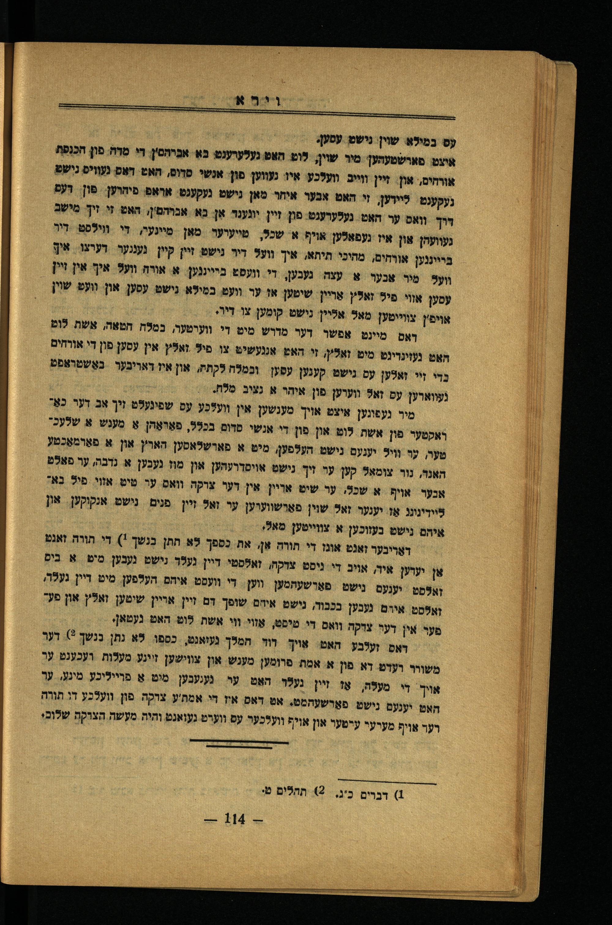 דאַריבער זאנט אונו די תורה אן, את כספך לא התן בִנשֶׁך') די תווה זאנט אן יערען איך, אוב די. ניסט צוקח, זאלסטי. ריין געלר נישט געבען. מיט. א ביס יענעם פאַרשעהמען ווען. די עפש איהם העלפען. מיט ריין געלר, זאלסט אירם געבען בכבוך, נישט איחם שופך דם זיין אריין שיטען זאלץ און פעמער אין דער צרקה וואם די טיסט, אַזױ וי אשת לוט האש געטאן.