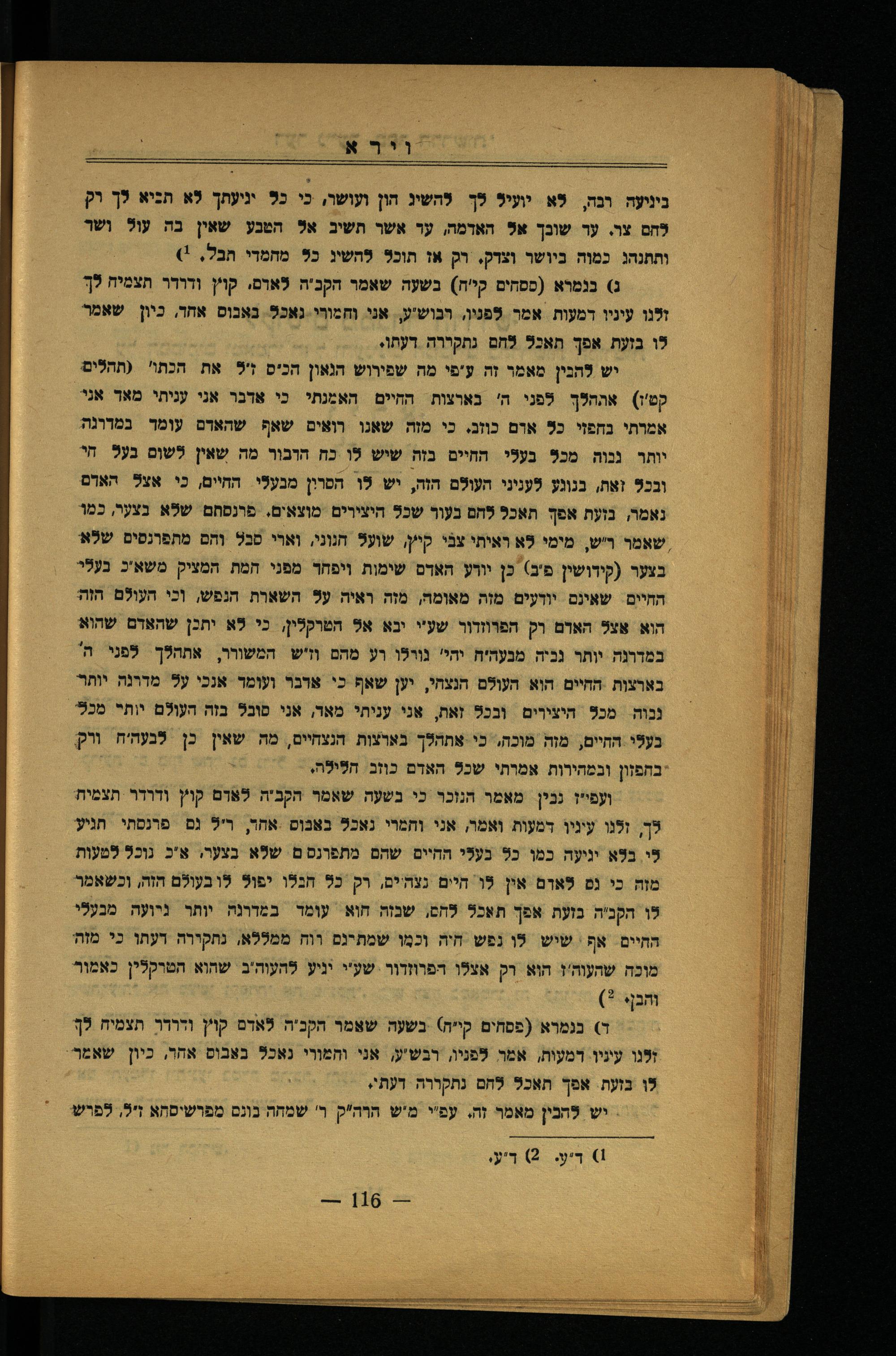 יש להבין מאמר זה ע'פי מה שפירוש הנאון הכיס זיל את הכתו'(תהלים קט'ז) אתהלך לפני ה' כבארצות החיים האמנתי כי אדבר אני עניתי מאר אני. אמרתי נחפוי כל אדם כוזג. כי מזה שאנו רואים שאף שהארם עומר נמררגה יותר גנוה מכל בעלי החיים נזה שיש לו כח הרבור מה שאין לשום בעל חי וכל זאת, כנונע לעניני העולם הזה, יש לו הפרון מבעלי החיים, כי אצל הארם נאמר, מזעת אפֿך תאכל לחם נעור שכל היצירים מוצאים. פונסחם שלא בצער, כמו /שאמר ריש, מימי לא ראיתי צבֿי קיץ, שועל חנוני, וארי בל והם מתפרנסים שלא נצער(קידושין פיב) כן יווע האדם שימות ויפחר מפּני חמת המציק משאיכ בעלי החיים שאינם יודעים מזה מאומה, מזה ראיה על השארת הנפש, וכי העולם הות הוא אצל הארם וק הפרוזדור שע"י יבא אל הטרקלין, כי לא יחכן שהאדם שהוא במדרנה. יותר גכיה מנעחיח יהי' גוולו וע מהם וו'ש המשורר, אתהלך לפני ה' כארצות החיים הוא העולם הנצהי, יען שאף כי ארכר ועומד אנכי על מדרנה יותר ננוה מכל היצירים וככל זאת, אני עניהי מאר, אני פונל בזה העולם יותײ מכל' בעלי החיים, מזה מוכה. כי אתהלך כארצות הנצחיים, מה שאין כן לבעהיח ורק, בחפזון ונמחירות אמותי שכל האדם כוזב הלילה,