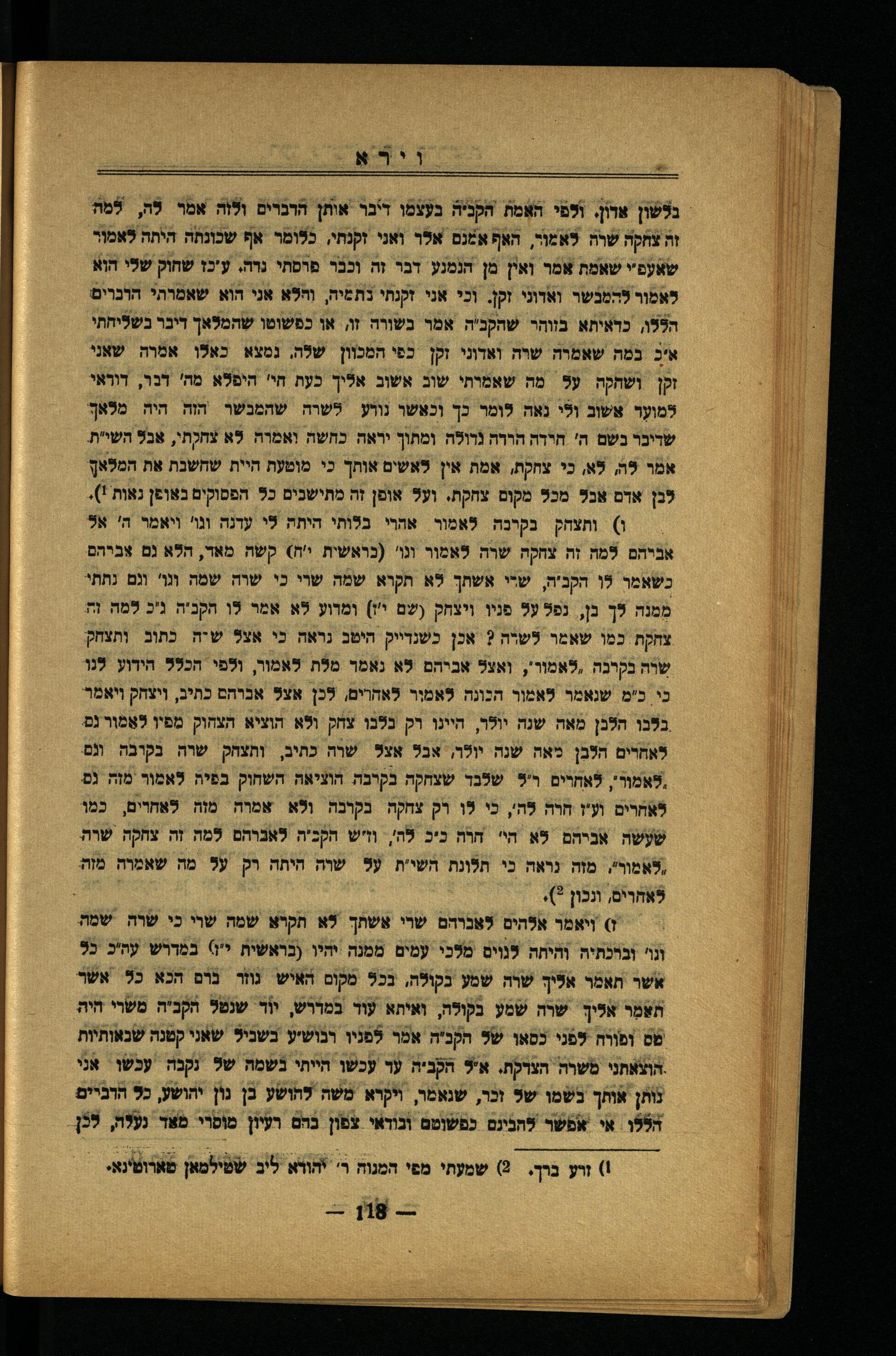 וירא. 2 נלשון ארון. ולפי האמת הקכיה בעצמו דיבר אותן הרכרים ולוה אמר לה, למה זה צחקה שרה לאמוי, האף אלַנם אלך ואני זקנתי, כלומר אף שכונתה היחה לאמור שאעסיי שאמח אמר ואין מן הנמנע. דבר זה וְכבֹר פרסתי נרה. עיכז שחוק שלי הוא לאמור להמכשר ואדוני זקן. וכי אני זקנתי נתמיה, והלא אני הוא שאמרהי הונרים הללו, כדאיתא בווהר שהקנ'ה אמר נשורה זו, או כפֿשוטו שהמלאך דיבר בשליחתי איכ נמה שאמרה שוה ואדוני זקן כפי המכוון שׁלה. נמצא כאלן אמרה שאני זקן ושחקה על מה שאמיתי שוב אשוב אליך כעת הי' היפלא מה' דנו, דוראי למוער אשוב ולי נאה לומר כך וכאשו נווע לשׁרה שֹׁהמַנשׁר חזה היה מלאך שדיבר נשם ה' חידה הררה נרולה ומתון יראה כחשה ואמרה לא צחקתי, אבל השיית. אמר לה, לא, כי צחקת, אמת אין לאשים אותך כי מוטעת היית שחשנת אֶת המלאך לנן ארם אנל מכל מקום צחקת. ועל אופן זה מתישנים כל הפסוקים באופן גאות!),