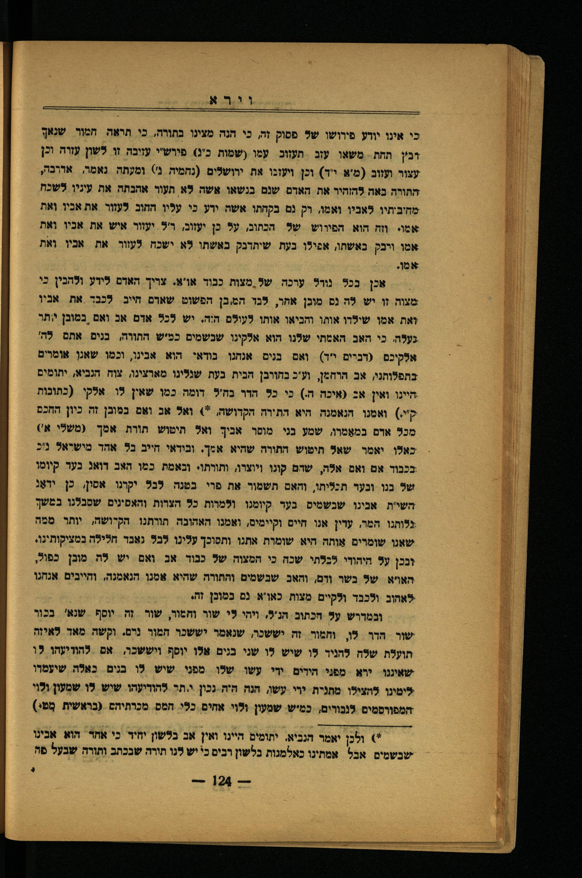 אכן ככל נורל. ערכה של.מצות כבוד או'א. צויך האדם לידע ולהכין כי מצוה זו יש לה נס מוכן אחר, לכו המ.בן הפשוט שארם חייב לכבד את אבנין זאת אמן שילדו אותו והכיאו אותו לעולם היה. יש לכל אדם אכ ואם, במובן יותר געלה. כי האב האמתי שלנו הוא אלקינו שכשמים כמיש החתווה, כנים אתם לה' (רביים י"ד) ואם בנים אנהגן בודאי הוא אבינו, וכמן שאגן אומרים בתפלותני, אב הוחמן, וע"כ בחוובן חבית כעת שנלינו מארצינו, צוח הנביא, יתומים חיינו ואין אב(איכה ה.) כי כל הדו נח'ל דומה כמן שאין לו אלקי(כתובות ק".) ואמנן הנאמנה. היא התירה הקדושה,*) ואל אכ ואם כמובן זה כיון החכם מכל אדם במאַמרו, שמע בני מוסר אכיך ואל תיטוש תורות אמך(משלי א') כאלו יאמר שאל חיטוש התורה שהיא אײך. ובודאי חייב בל אהד מישראל ניכ בככוד אם ואם אלה, שדם קונו ויוצרו, ותורתו. ובאמת כמן האב דואג כער קיומו של ננו ובער תנליתו, והאם תשמוו את פוי בטנה לבל יקרנו אסון, כן ידאַג השי"ת אנינו שנשמיס נער קיומנו ולמרות כל הצרות והאסינים שסבלנו במשך גלותנו המר, ערין אנו חיים וקיימים, ואמנו האהוכה תוותנו הקדושה, יותר ממה שאנו שומרים אַותה היא שומות אתנו ותסוכך עלינו לבל נאכר חלילה במציקותיגו, זככן על היהורי. לכלתי שכה כי המצוה של כנוד אב ואם יש לה מובן כפול, האויא של בשר וום, והאב שכשמים והתורה שהיא אמנן הנאמנה, וחייבים אנחנו לאחוב ולככד ולקיים מצות כאו'א גם כמובן זה,