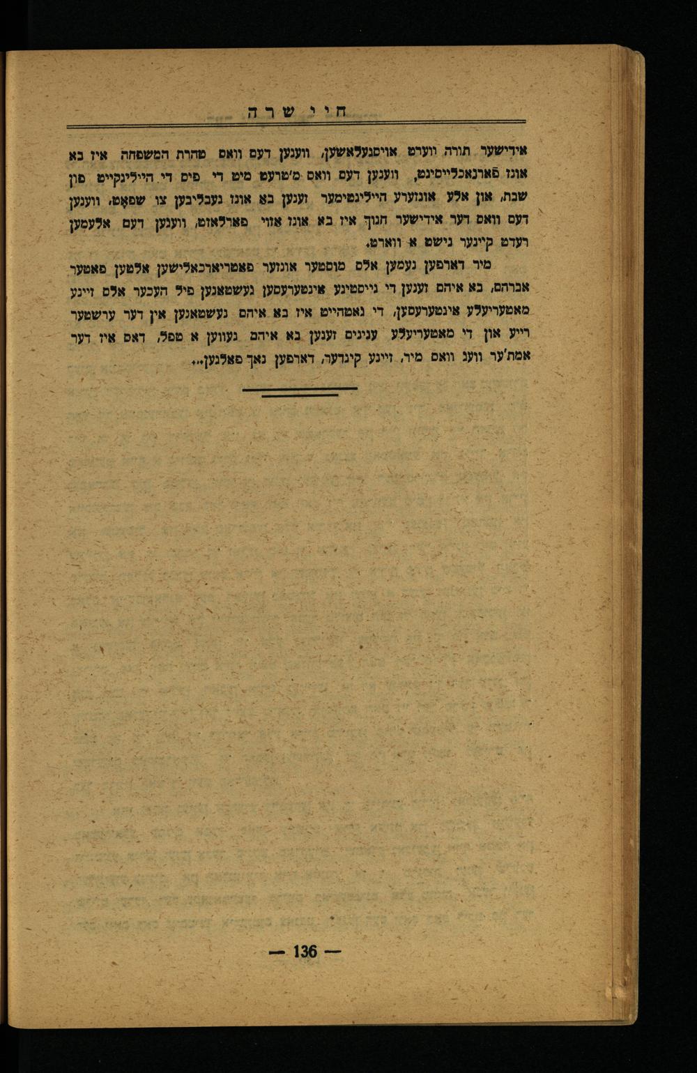 י חי ישר ה 0 יע: אירישער. תורה. ווערט אויפגעלאשען, ווענען דעם וואס טהרת המשפחה. איז בא אונז פֿארנאכלייסינט, וענען דעם וואס מ'טועט מיט די פים די. היילינקייט. פון