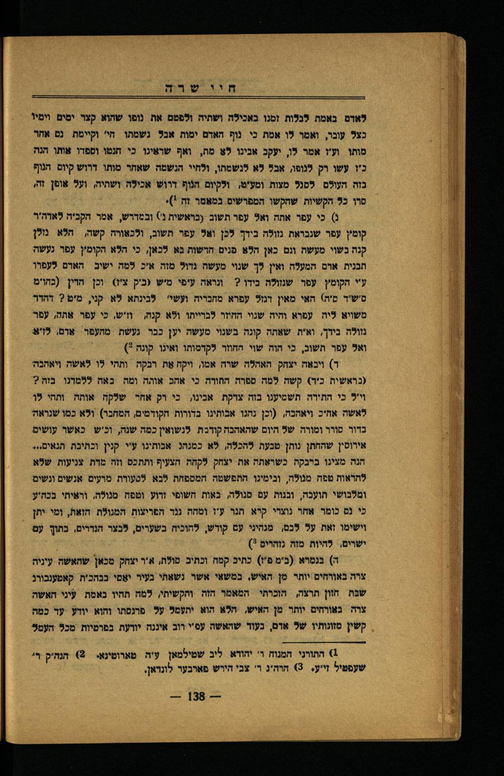 ד) וינאה יצחק האהלה שוה אמו, ויקח אֵת רבקה ותהי לו לאשה ויאהנה (נרואשית כיר) קשה למה ספרה החורה כי אהב אותה ומה באה ללמרנו כוה?' ול כי התירה תשמיענן בזה צרקת אבינו, כי וק אהי שלקה אותה ותהי לו לאשה אחיכ ויאהבה,(וכן נהנו אבותיגו נדורות הקודמים, המחבו) ולא כמו שנראהה בדור סורר ומורה של היום שהאהנה קודכת לנשואין כמה שנה, וכ'ש כאשר עושים אירוסין שהחתן נותן טבעת להכלה, לא כמנהג. אבותינו ע'י קנין וכתיבת תנאים:.. הנה מצינו ברנקה כשרואתה את יצחק לקחה הצעיף ותתכס וזה מרת צניעות שלא להראות שפח מגולה, ונימינן התפשטה המספחת לכא לכעוות מועים אנשים ונשים ומלבושי תועכה, ובנות עם סנולה, באות השופי זרוע ומפה מגולה, וראיתי בכה'ע כי נם כומר אחו נוצרי קרא תנר ע"ז ומחה ננֹר הפריצות המנולת הזאת, ומי יתן וישימו זאת על לכם, מנהיני עם קודש, להוכיח בשערים, לנער הנדרים, כתוך עם ישרים.. להיות מזה נזהרים?)