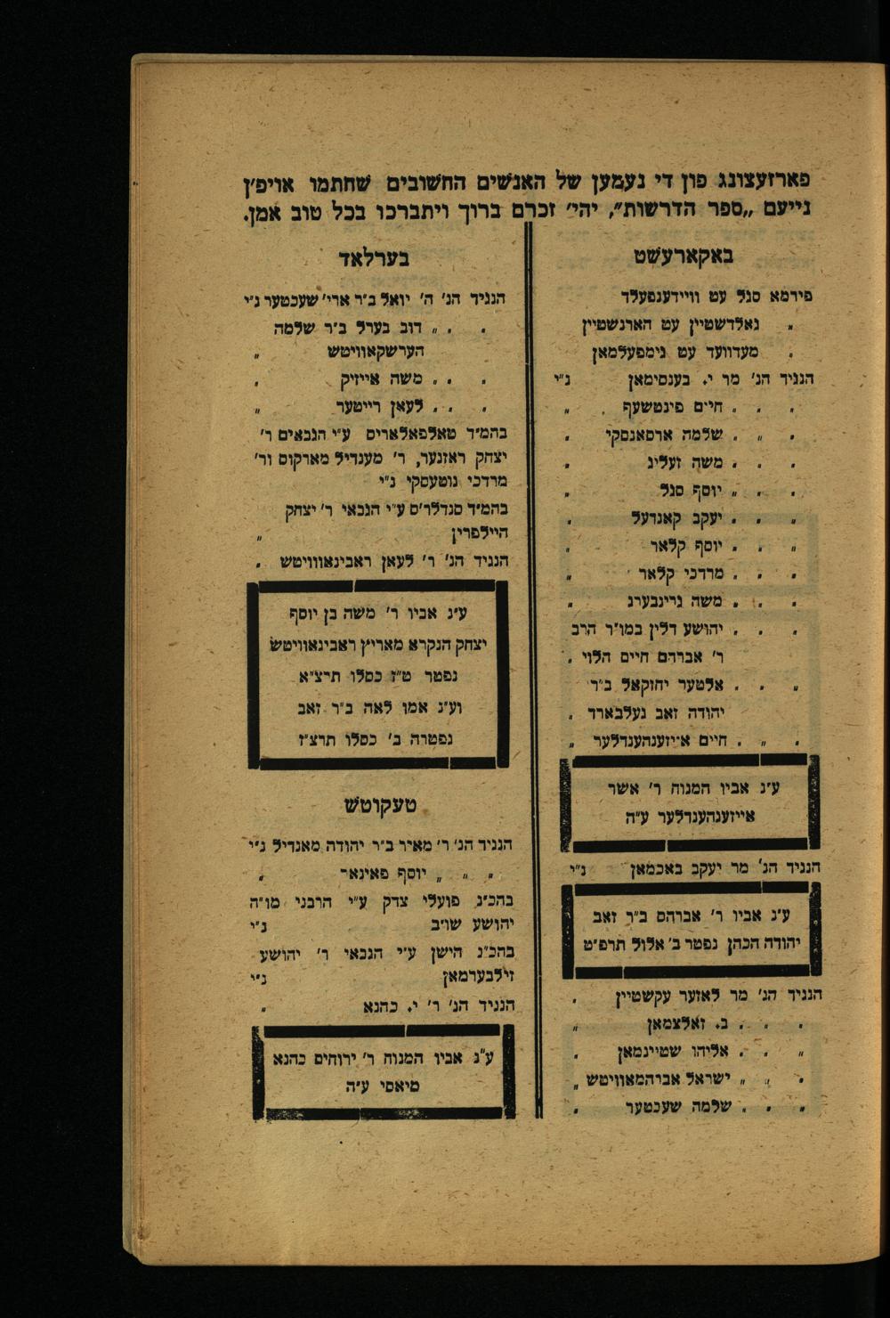 פארזעצונג פון די נעמען של האנשים החשובים שֹׁחתמו אויפ'ן נייעם.,ספר הדרשות", יהי זכרם ברוך ויתברכו בכל טוב אמן.