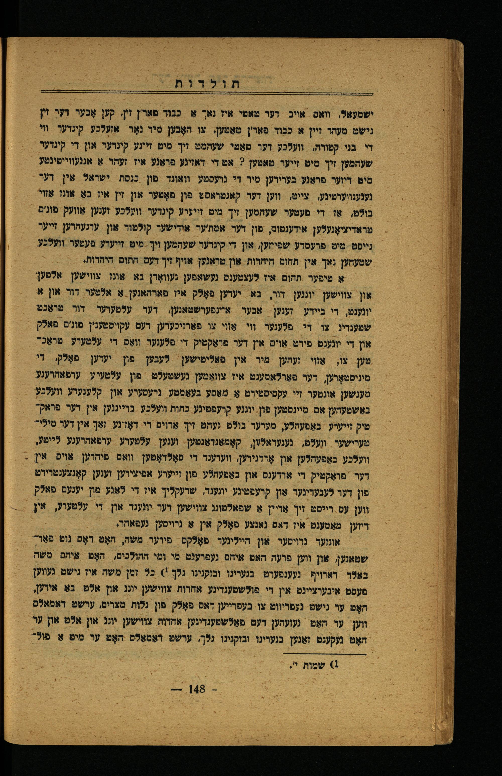 נרויסער און היילינער פאָלקס. פיוער משה, האָט דאָס נוט פּאַר-. שטאנען, און ווען פועה האט איהם געפרענט מי ומי ההולכים,. האָט איהם משה באלד דארויף בגערינו ובזקנינו נלך!) כל זמן משה איז נישט געווען, פֿעסט אינערציינט אין די פולשטענדינע אחרות צווישען יונג און אלט נאַ אידען, האָט עו נישט געפריווט צו בעפרייען דאס פאָלק פון נלות מצרים, ערשט דאמאלס ווען ער האַט געזעהען דעם פאַלשטענדינען אחדות צווישען יונג און אלט און ער האָט געקענט זאַנען בגערינו ובזקנינו נלך, ערשט דאַמאַלס האָט ער מיט אַ פול