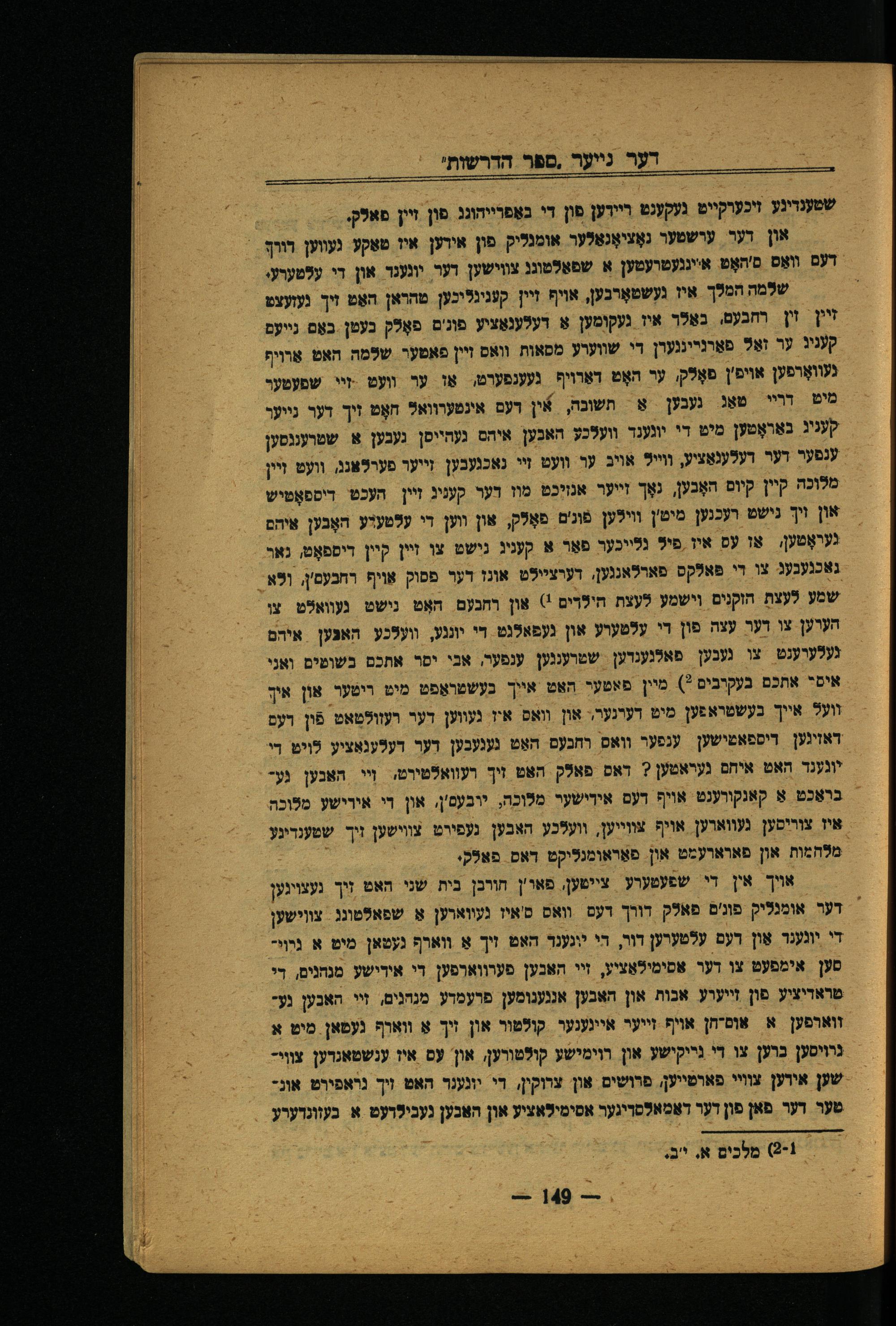 שלמה המלך איז געשטאָרבען, אויף זיין קעניגליכען טהראן האַט זיך געזעצט זיין זין רחבעם. באַלך איז. געקומען אַ דעלענאַציע פונ'ם פאָלק כעטן באַם נייעם קעניג ער זאַל פאַרנײינגערן די שווערע מסאות וואס זיין פאטער שלמה האט אַרױיף געװאָרפען אויפ'ן פאָלק, ער האָט דאַרױף געענפערט, אַז ער וועט-זיי שפעטער מיט דרי טאַג געכען אַ תשובה, אין דעם אינטערוואל האָט זיך דער נייער קעניג באַראָטען מיט די יוגענד וועלכע האכען. איהם געהייפן געבען א שטרעננסען ענפער דער דעלענאַציע, ווייל אויב ער װעט זי נאכגעכען זייער פערלאנג, ווע זיין מלוכה קיין קיום האָבען, נאָך זײיער אנזיכט מוז דער קעניג זיין העכט דיספאָטיש און זיך נישט רעכנען מיט'ן ווילען פֿונ'ם פאָלק, און ווען די עלטעלע האָבען איהם געראָטען, אַז עס איז ,פיל גלייכער פאַר א קעניג נישט צו זיין קיין דיפפאָט, נאר גאכגעכעג. צו די פאלקס פארלאנגען, דערציילט אונז דער פסוק אױיף רחבעם'ן, ולא שמע לעצת חוקנים וישמע לעצת הילרים') און רחנעם האָט נישט געוואלט צו הערען צו דער עצה פון די עלטערע און געפאלגט. די יוננע, וועלכע איהם געלערענט. צו געכען פאלנענדען-שטרענגען ענפער, אבי יסר אתכם כשומים ואני איסי אתכם בעקובים?) מיין פאטעך האט אייך בעשטראַפּט מיט ריטער און איך װעל אייך כעשטראפען מיט דערנער,. און וואס איז. געווען דער רעזולטאט פֿון דעם דאזיגען דיספאטישען ענפער וואס רחבעם האַט נענעכען דער דעלענאציע לוט רי יוגענד האט איחם געראטען? דאס פאלק האט זיך רעוואלטירט. זִיי האען נעבראַכט אַ קאנקורענט אויף דעם אידישער מלוכה, יובעס'ן, און די אירישע מלוכה איז צוריסען געווארען. אויף צווייען, וועלכע האבען געפירט צווישען זיך שטענדיגע מלחמות און פארארעמט און. פאַראומגליקט דאס פאלק.