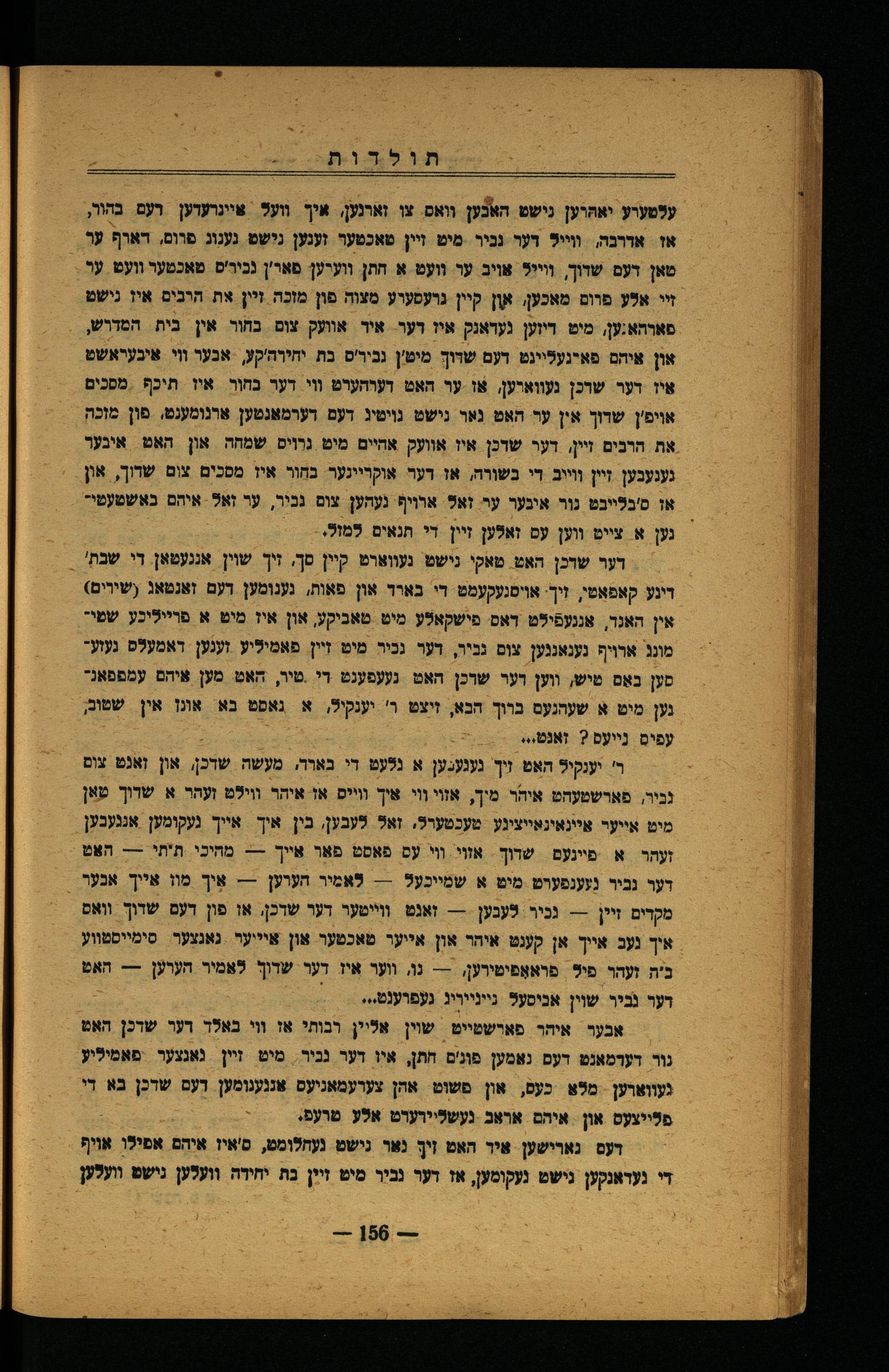דער שדכן האט. טאקי נישט געווארט קיין סך, זיך שוין אננעמאן. די שבת' דינע קאפאטי, זיך. אויסגעקעמט די בארר און פאות, גענומען דעם זאנטאג(שירים) אין האנד, אנגעפֿילט דאס פישקאלע מיט טאכיקע, און איז מיט א פרייליכע שמימונג ארויף נענאננען צום גביר, דער גכיר מיט זיין פאמיליע זענען. דאמעלם געוע" סען באַם טיש, ווען דער שרכן האט נעעפענט די-טיר, האט. מען איהם עמפפאנה נען מיט א שעתנעם ברוך חבא, זיצט ר' יענקיל, א נאסט כא. אונן אין שֹטוֹב, עפים נייעס? זאנט...:
