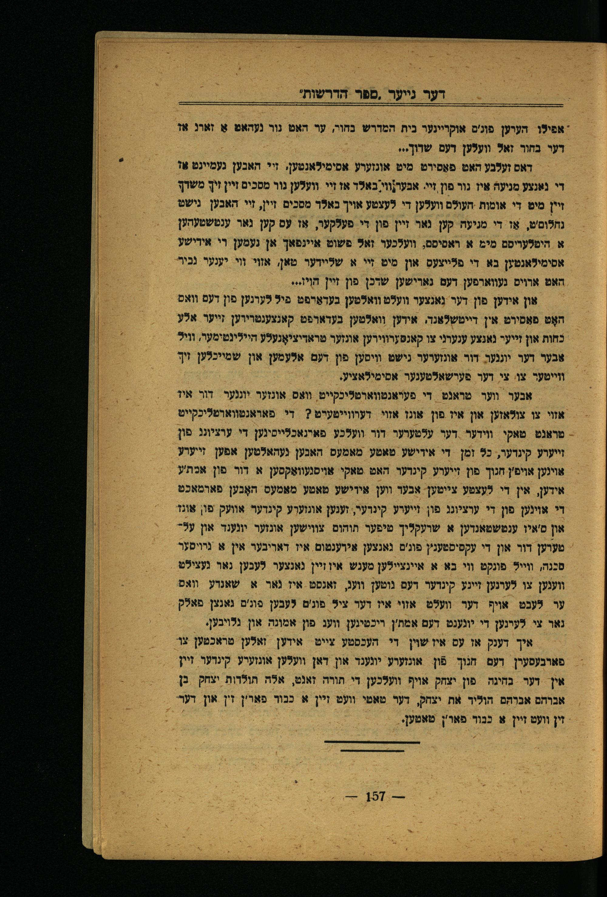איך דענק אז עס איז שוין די העכסטע ייט אידען זאלען טראכמען צו פארבעסערן דעם חנוך פֿון אונזערע יוגענד און דאן וועלען אונזערע קינרער זיין דער כחיגה- פון יצחק אויף וועלכען די חורה זאנט, אלה תולדות יצחק בן אברהם אברְהם הוליך אח יצחק, דער טאטי וועט זיין א כבור פאר'ן זין און. דער" זין וועט זיין א כנור פאר'ן טאטען.