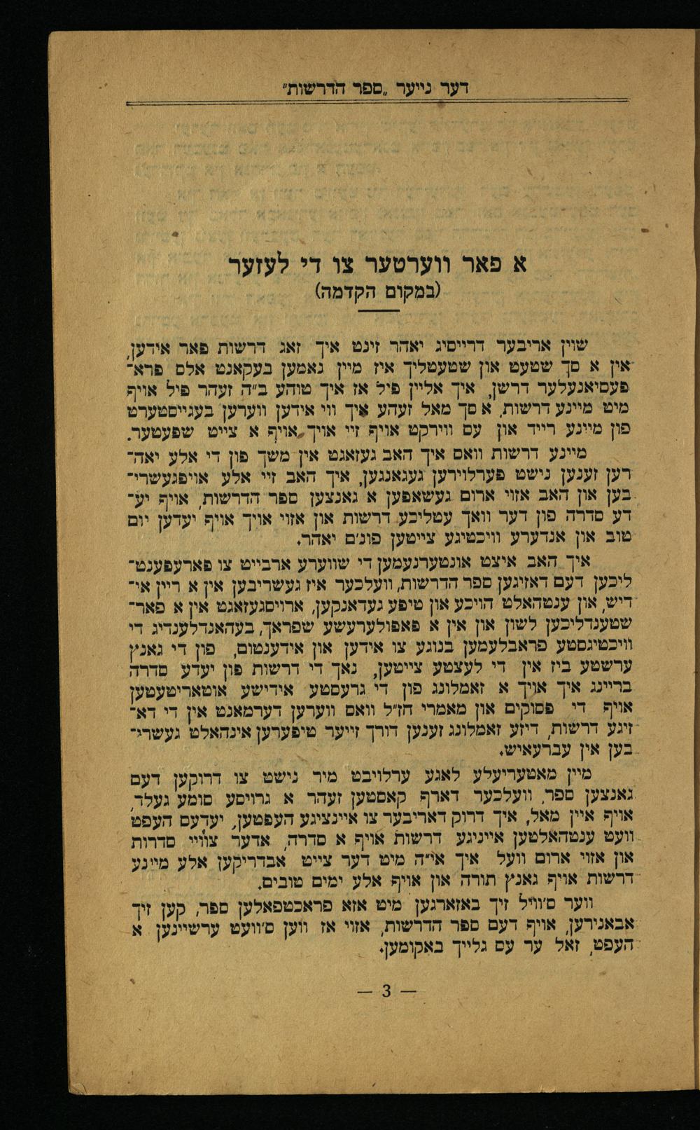 איך האב איצט אונטערנעמען די שווערע ארבייט צו פארעפענטליכען דעם דאזיגען ספר הדרשות, וועלכער איז געשריבען אין א ריין איז דיש, און ענטהאלט הויכע און טיפע געדאנקען, ארויסגעזאגט אין א פארשטענדליכען לשון און אין א פאפולערעשע שפראך, בעהאנדלענריג די וויכטיגסטע פראבלעמען בנוגע צו אידען און אידענטום,- פון די גאנץ ערשטע ביז אין די לעצטע צייטען, נאך די דרשות פון יעדע סדרה.= בריינג איך אױיך א זאמלונג פון די גרעסטע. אידישע אוטאריטעטען אויף די פסוקים און מאמרי חז"ל וואס ווערען דערמאנט און די דא" זיגע דרשות, דיזע זאמלונג זענען דורך זייער טיפערען אינהאלט געשר.יבען אין עברעאיש,!
