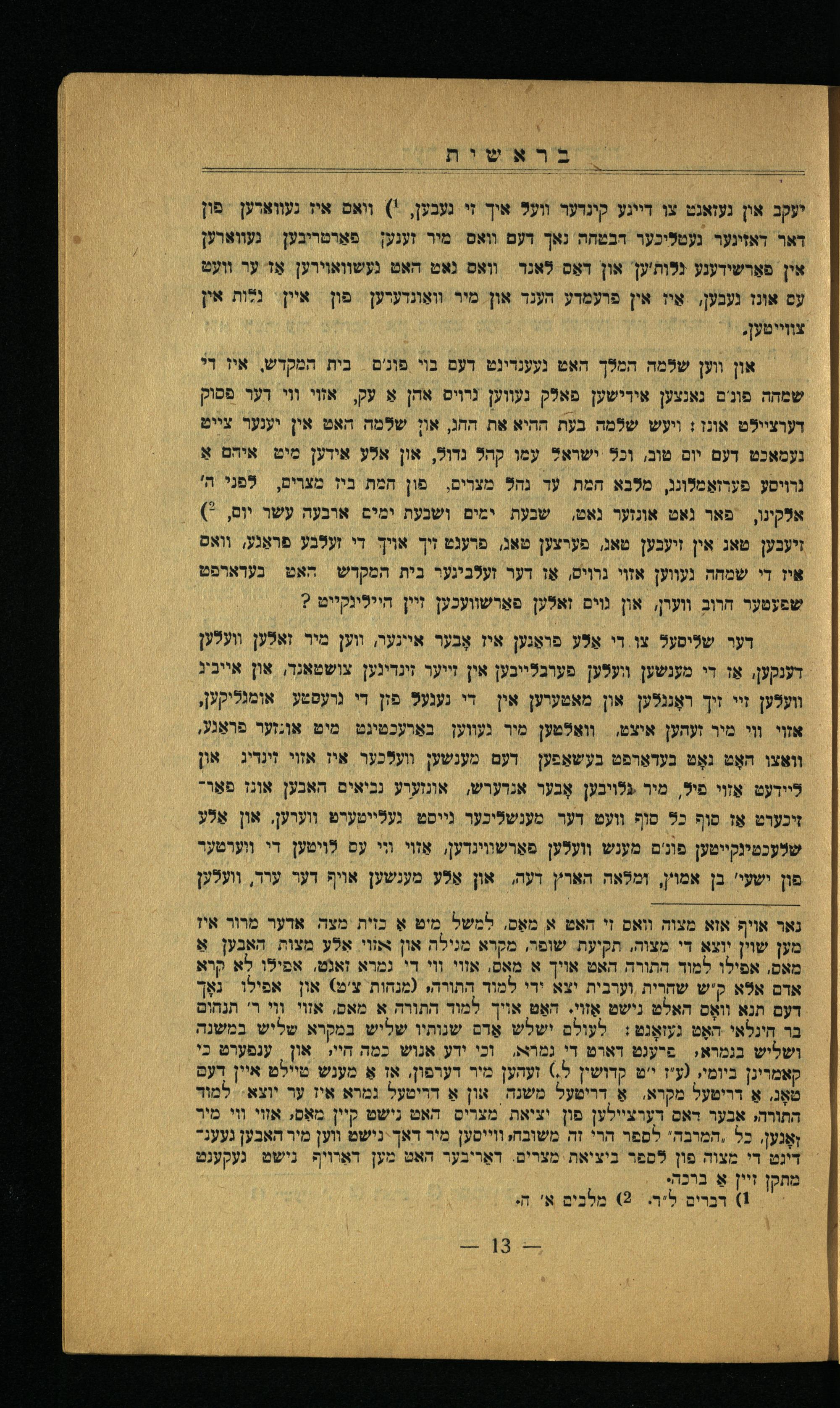 נאר אויף אזא מצוה וואס זי האט א מאַס. למשל מיט אַ כזית מצה. אדער מרור איז מען שוין יוצא די מצוה. תקיעת. שופר, מקרא מנילה און אזוי. אלע מצות האבען אַ מאס, אפילו למוד התורה האט אויך א מאס. אזוי וי די נמרא זאנט. אפילו לֵא קרא אדם אלא קיש שחרית וערבית יצא ירי למוד התורה,(מנחות צ'ט) אפילו גאָך דעם תנא װאָס האלט נישט אַזױ. האַט אויך למוד התורה א מאם. אזוי וי ר' תנהו בר חינלאי האָט געזאָנש: לעולם ישלש אַדם שנותוו שליש במקרא שליש במשנה ושליש בגמרא, פיעגט דארט די גמרא, וכי ידע אנוש כמה חי: און ענפערט כי קאמרינן כיומי,(ע"ז י'ט קדושין ל,) זעהען מיר דערפון, אז אַ מענש טיילט איין דעם טאָג, אַ דרימעל מקרא. אַ דריטעל משנה. און אַ הדיטעל נמרא איז ער יוצא. למור התורה, אבער דאס דערציילען פון יציאת מצריס האט נישט קיין מאַס; אזוי וי מיר זאָנען. כל-חמרבה' לספר הרי זה משובח, ווייסען מיר דאך-נישט ווען מיר האבען געענדיגט די מצוה פון לספר כיציאת. מצרים. דאַריבער האט מען דאַרױף נישט געקענט מתקן זיין אַ ברכה. 1) דברים ל"ר. 2) מלבים א' הי