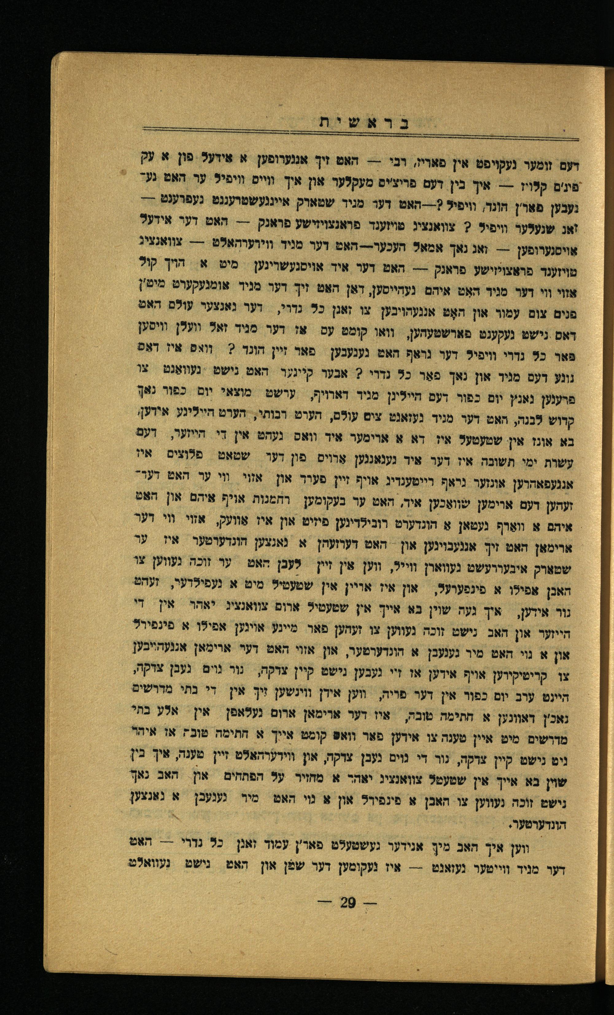 דעם זומער געקויפט אין פאריז, רבי--- האט זיך אנגערופען א אידע?. פון א עק יפונ'ם קלויז-- איך בין דעם פריצ'יס מעקלער און איך וויים וויפיל ער האט געד נעבען מאר'ן הונר, וויפיל?---האט דער מניר שטארק איינגעשטרעננט געפרענט יי זאג שנעלער וויפיל? צוואנציג טויזענד פראגצויזישע פראנק--- האט דער אידעל אַוסגערופען-- זאג נאך אמאל העכער---האט דער מניד ווירערהאלט--- צוואנציג טויזענר פראצויזישע פראנק-=- האט דער איד אויסנעשרינען מיט א הױיך קול אזוי וי דער מניר האט איהם נעחייסען, דאַן האט זיך דער מניר אומנעקערט מיט'ן פנים צום עמור און האָט אנגעהויבען צו זאגן כל נדוי, דער גאנצער עולם האש דאס נישט געקענט פארשטעהען, וואו קומט עס אז דער מניד זאל ועלן וויסען פּאר כל נדרי וויפיל דער נראף האט גענעבען פאר זיין הונר?= וואפ איז דאס נונע דעם מניר און נאך פאַר כל נדרי 2 אבער קייגער האט נישט געװאַגט= צו פרענען נאנץ יום כפור דעם הייליגן מניד דארויף,= ערשט מוצאי יום כפור נאך קרוש לבנה, האט דער מניר נעזאנט צים עולם, הערט רבותי, הערט היילינע אידען, בא אונז אין שטעטעל איז דא א ארימער איד וואס נעהט אין דִי הייזער, דעם עשרת ימי תשוכה איז דער איר גענאנגען אַרױם פון דער שטאט. פּלוצים איז אנגעפאהרען אונזער גראף רייטענדיג אויף זיין פערר און אזוי װי ער האט דערזעהען דעם ארימען שװאַכען איר, האט ער בעקומען רחמנות אויף איהם און האט איהם א װאַרף נעטאן אַ הונדערט רונילריגען פיזיט און איז אַװעק, אזוי וי רער ארימאן האט זיך אנגעבוינען און- האט דערועהן א נאנצען הונדערטער. איז= ער שטארק איבערועשט געווארן ווייל, ווען אין זיין לעבן האט= ער זוכה געווען צו האכן אפילן א פינפערעל, און איז אויין אין שטעטיל מיט א געפילרער, זעהט נור אידען,- איך געה שוין בא אייך אין שטעטיל ארום צוואנציג יאתר אין די הייזער און האב נישט זוכה נעווען צו זעהען פאר מיינע אוינען אפילן א פֿינפיר? און א גוי האט מיר גענעבן א הונדערמער, און אזוי האט דער ארימאן אנגעהייבען צו קרימיקירען אויף אידען או זי נעבען נישט קיין צרקה, נור גוים געבן צודקה, היינט ערב יום כפור אין דער פויה, ווען אידן ווינשען זִיךְ אין די נתי מררשים נאכ'ן דאוונען א חתימה טובה, איז דער ארימאן ארום אין אלע בתי מדרשים מיט איין טענה צו אידען פאר וואס קומט אייך א חתימה שוב אז איהר ניט נישט קיין צרקה, נור די נוים נעבן צרקה, און ווירערהאלט זיין טענה, איך בין שוין בא אייך אין שטעטל צוואנציג יאה- א מחזיר על הפתחים און האב נאך. נישט זוֹכה נעווען צו האבן א פינפירל און א מי הא מיר גענעכן א גאנצען הונדערטער. 2