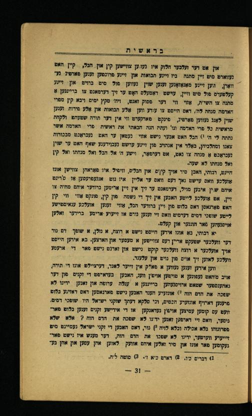 לייטע שופכי דמים דערמיט וואס זי זענען נורם אז זייערע-ארימע ברידער זאלען אויסנעהען פֿאר הוננער און קעלט. יא ובותי, כאַ אונז אידען הייסט נישט א רוצח, א מולן, א שופן דם נור דער וועלכער שפעקט אריין דעם צווייטען א מעסער און הארצען. בא אירען הייסט אויך אזעלכער א רוצה וועלכער קוקט נישט און זארנט נישט פאר. די ארעמע וועלכע לאזען זיך אויס פֿון גויט און עלענר. ווען אירען זענען נעווען א פאלק אין זייער לאנד, דערציילט אונו די תּורה, אוב מ'האט נעפונען א טויטען אוים'ן וועג, האנען בערארפט די וקנים פון דער נאהענסטער שמאט ארויסנעהען- ברייננען א ערופה און זאנען. ירינו לא שפנה את הרם הזה?) אונזערע הענר האבען נישט פארנאסען דאם דאזיגע בלוט פֿוענען דארויף אונזערע חכמים, וכי סלקא דעתך שוקני ישראל שופכי. דמים, וועט עס קומען עמיצען אוים'ן געראנקען= או די אירישע זקנים זענען בלוט פאר" גימער, וואס זי דארפען זאנען יר'נו לא שפכה את הרם הוה? אלא שלא פטרונוהן כלא אכילה וכלא לויה?) נור, דאם האכען די זקני ישראל נעמיינט מיט זיייערע ווערמער, ירינו לא שפכו את הום הוה, דער מענש איז נישט פארגעקומען פאר אונז און מיר זאלען איהם אוועק. לאוען אהן עפען און אהן בע"