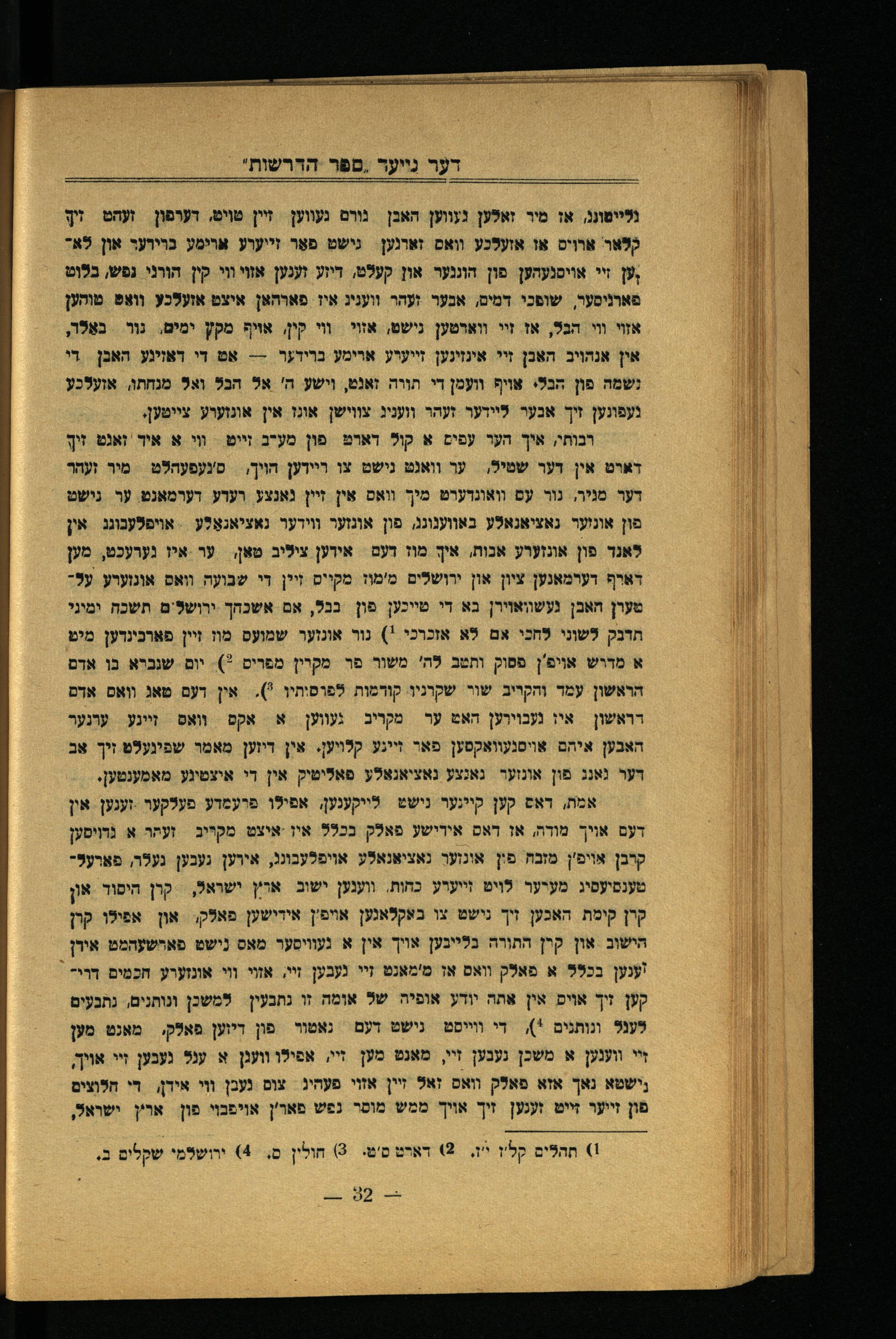 רבותי, איך הער עפים א קןול דארט פון מעיב זייט= װי א איך זאגט זיך דארט אין דער שטיל, ער וואגט נישט צו ריידען הויך, ס'נעפעהלט מיר זעהר דער מניר, נור עס וואונדערט מיך וואס אין זיין גאנצע רערע דערמאנט. ער נישט פון אונזער נאציאנאלע נאווענונג, פון אונזער ווידער נאציאנאַלע- אױיפּלעבונג אין לאנד פון אונזערע אכות, איך מוז אידען ציליב טאן ער איז גערעכט, מען דארף דערמאנען ציון און ירושלים מ'מוֹז מקייס זיין די שבועה וואס אונזערע עלמערן האבן געשוואוירן בא די טייכען פון ננל, אם אשכחך ירושלים תשכה ימיני תדנק לשוני לחכי אם לא אזכרכי') נור אונזער שמועס מוו זיין פארכינרען מימ א מדיש אויפ'ן פסוק ותטב לה' משור פר מקיין מפריס'). יום שנברא כןו אדם: הראשון עמד והקויב שוי שקוניו קודמות לפוסיתיו').. אין דעם טאג וואס אדם: דראשון איז געבוירען האט ער מקריב געווען א אקם וואס זיינע ערנער: האבען איהם אויסנעוואקטען פאר זיינע קלויען. אין דיזען מאמר שפיגעלט זיך אב דער נאנג פֿון אונזער נאנצע נאציאנאלע פאליטיק אין די איצטינע מאמענטען.