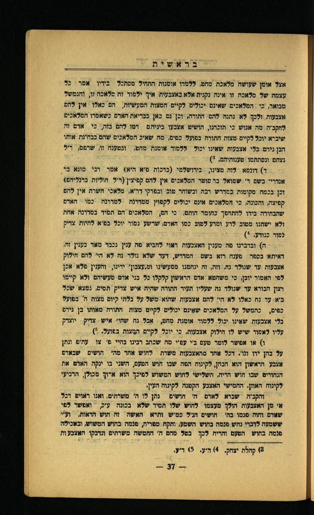 ד) דונמא. לזה מצינו,- כורושלמי(כוכות פ'א היא) אמו וכי מונא בֿל, אנדריי כשם ר' שמואל. בר סוטר המלאכים אין להם קפיצין(ר'ל. חוליות כונליהם) זכן בכמה מקומות במדרש רכה ובשוחר טום ובפוקי דר"א, מלאכי חשרת אין להם קפיצה, והכונה, כי חמלאכים אינם יכולים לקפוץ ממחרנה=-כמו= הארם שחבחירה כידו לחתחפך כחומר חותם,| כי הם,/ המלאכים הם' תמיר כמררנה אחת ולא ישחנו מטוב לוע ומרע לטוב כמו האדם, שרשע נמור יוכל בפ'א להיות צריק נמור כנורע.+) י