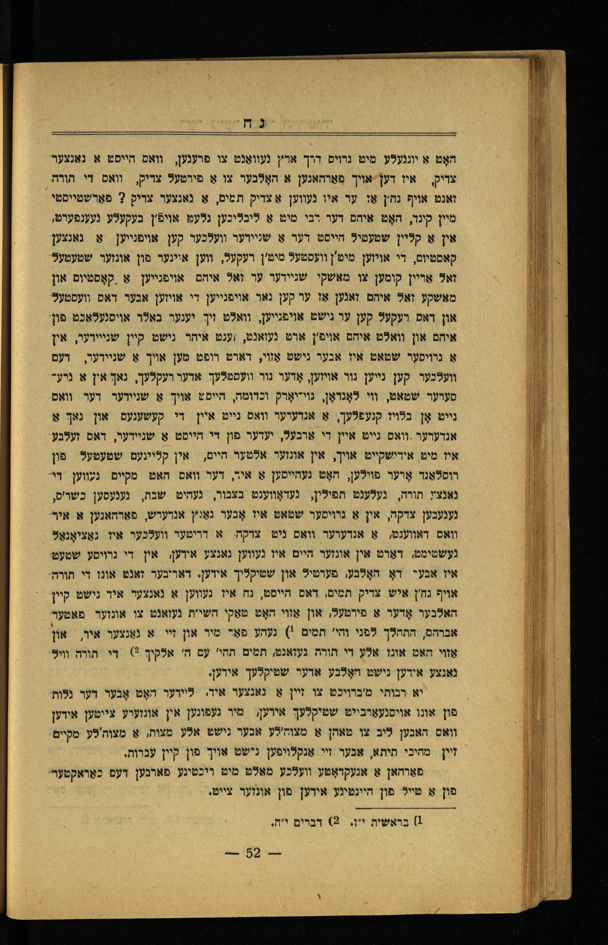 האָט א יונגעלע מיט גרוים דרך אר'ץ געוװואַגט צו פרעגען, וואס הייסט א נאנצער צריק,= איז דע אויך פאַרהאנען א האָלנער צו אַ פירטעל צדיק, וואס די תורה זאנט אויף נח'ן אַז ער איו געווען אַ צדיק תמים, אַ נאנצער צריק? פאַרשטייסטי מיין קינד, האָט איהם דער רבי מיט אַ ליבליכען נלעט אױפֿין בעקעלע געענפערט, אין אַ קליין שטעטיל הייסט דער אַ שליירער וועלכער קען אויפנייען אַ גאנצען קאסטיום, די אויזען מיט'ן וועסטעל מיט'ן רעקעל, ווען איינער פון אונזער שטעטעל: זאל אַריין קומען צו מאשקי שניידער ער זאל איהם אױפנייען אַ;קאָסטיום און מאשקע זאל איהם זאגען אז ער קען גאר אויפנייען די אויזען אכער דאס וועסטעל און דאס רעקעל קען ער נישט אויפנייען, וואלט זיך יענער באלר אויסנעלאכט פוןאיהם און וואלט איהם אויפ'ן ארט געזאגט, וענט איהר נישט קיין שנייירער, אין אַ נוויסער שטאט איז אנער נישט אַזױ, דארט רופט מען אויך אַ שניידער, דעם וועלכער קען נייען נוו אויזען, אָדער נור וועסטלעך ארער רעקלעך, נאך אין א נרעסערער שטאט, ווי לאָנראָן, נױדיאָרק וכדומה, הייסט אויך אַ שניידער דער וואס נייט אָן בלויז קנעפלעך, אַ אנדערער וואס נייט איין די קעשענעם און נאך אַ אנדערער-וואס גייט איין די אַרבעל, יעדער פון די הייסט אַ שניידער, דאס זעלבע איז מיט אידישקייט אויך, אין אונזער אלטער היים, אין קליינעם שטעטעל פון רוסלאַנר אָרער פוילען, האָט געהייסען אַ איך, דער וואס האט מקיים געווען די" גאנצין תורה, געלעגט תפילין, געדאָווענט כצכור, נעהיט שבת, גענעסען כשר'ס, געגעכען צדקח, אין אַ גרויסער שטאט איז אָכער נאַנץ אנדערש, פאַרהאנען א איר' וואס דאווענט, אַ אנדערער וואס גיט צרקה. א דריטער וועלכער איז נאַציאָנאַל געשטימט, דאַרט אין אונזער היים איז געווען נאנצע אידען, אין די גרויסע שטעט איז אנעי דאָ האָלנע, פערטיל און שטיקליך אידען. דאריבער זאנט אונז די תורה. אויף נח'ן איש צדיק תמים, דאס הייסט, נח איז געווען אַ גאנצער איד נישט קיין האלבער אָדער אַ פירטעל, און אַזױ האָט טאַקי השי"ת געזאגט צו אונזער פאטער אברהם, התהלך לפני והי! חמים!) געהע פאַד מיר און זי א נאַנצער איר, און אַזױ האט אונז אלע די תורה געזאגט, תמים תהי' עם ה' אלקיך?) די תורה ויל' נאנצע אידען נישט האָלכע אדער שטיקלעך אידען,