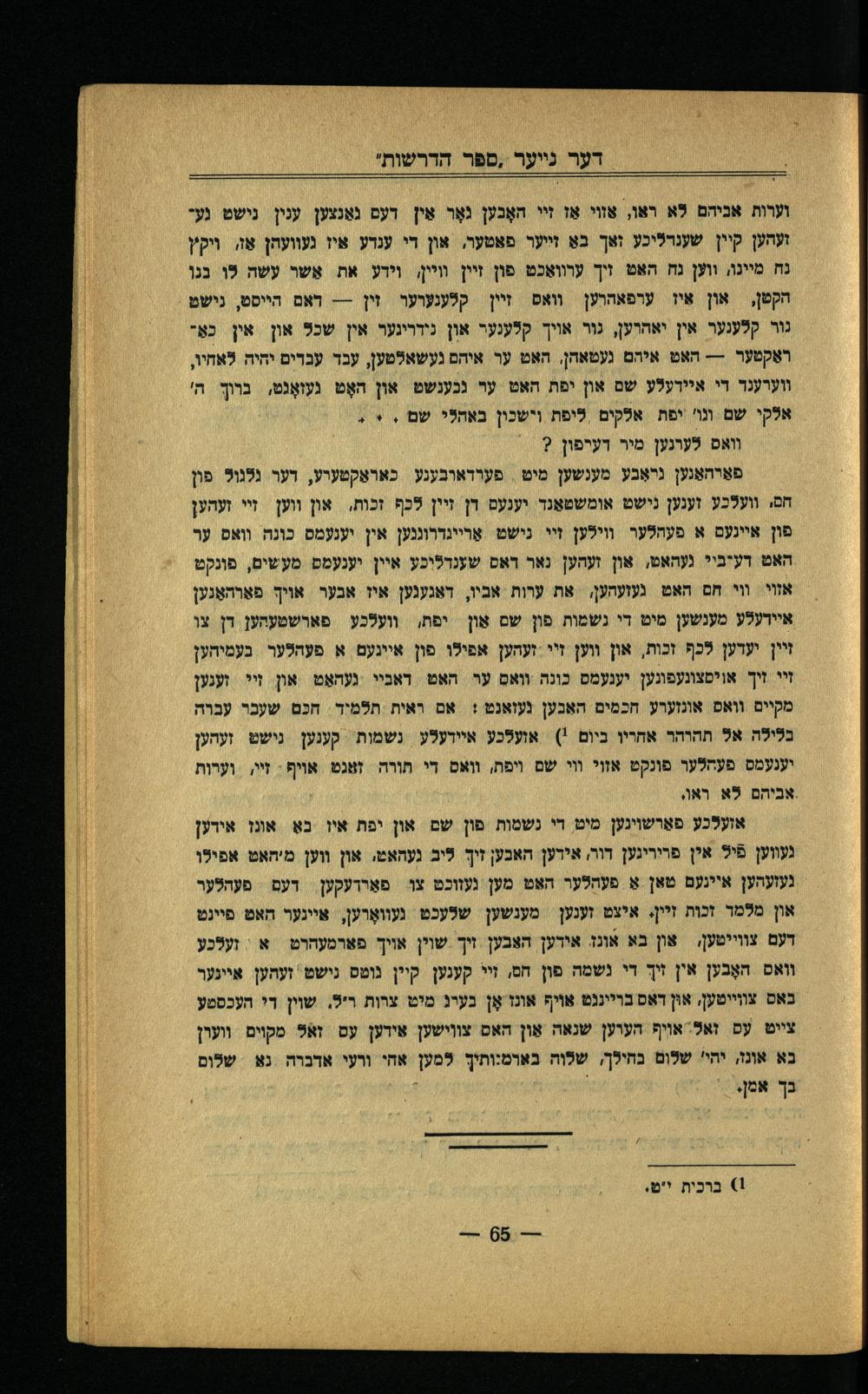 אזעלכע פאַרשױנען מיט די נשמות פון שם און יפת איו נאַ אנז אידען געווען פֿיל אין פריריגען דור, אידען האכען זיך ליב געהאט. און ווען מיהאט אפילן געזעהען איינעם טאן אַ פעהלער האט מען געזוכט צו פאַרדעקען דעם פעהלער און מלמד זכות זיין. איצט זענען מענשען שלעכט געװאָרען, איינער האט פיינט דעם צווייטען, און בא אונז אידען האבען זיך שוין אויך א זעלכע וואס האָבען אין זיך די גשמה פון חם, זיי קענען קיין נוטס נישט' זעהען איינער באס צווייטען, אוּן דאס בריינגט אויף אונז אָן נעריג מיט צרות ריל. שוין די העכסמע צייט עס זאל: אױף העוען שנאה אַון האס צווישען אידען עס זאל מקוים ווערן נא אונז, יהי' שלום נחילך, שלוה בארמ:ותיך למען אהי ורעי אדכרה נא שׁלום בך אמן.' יְ