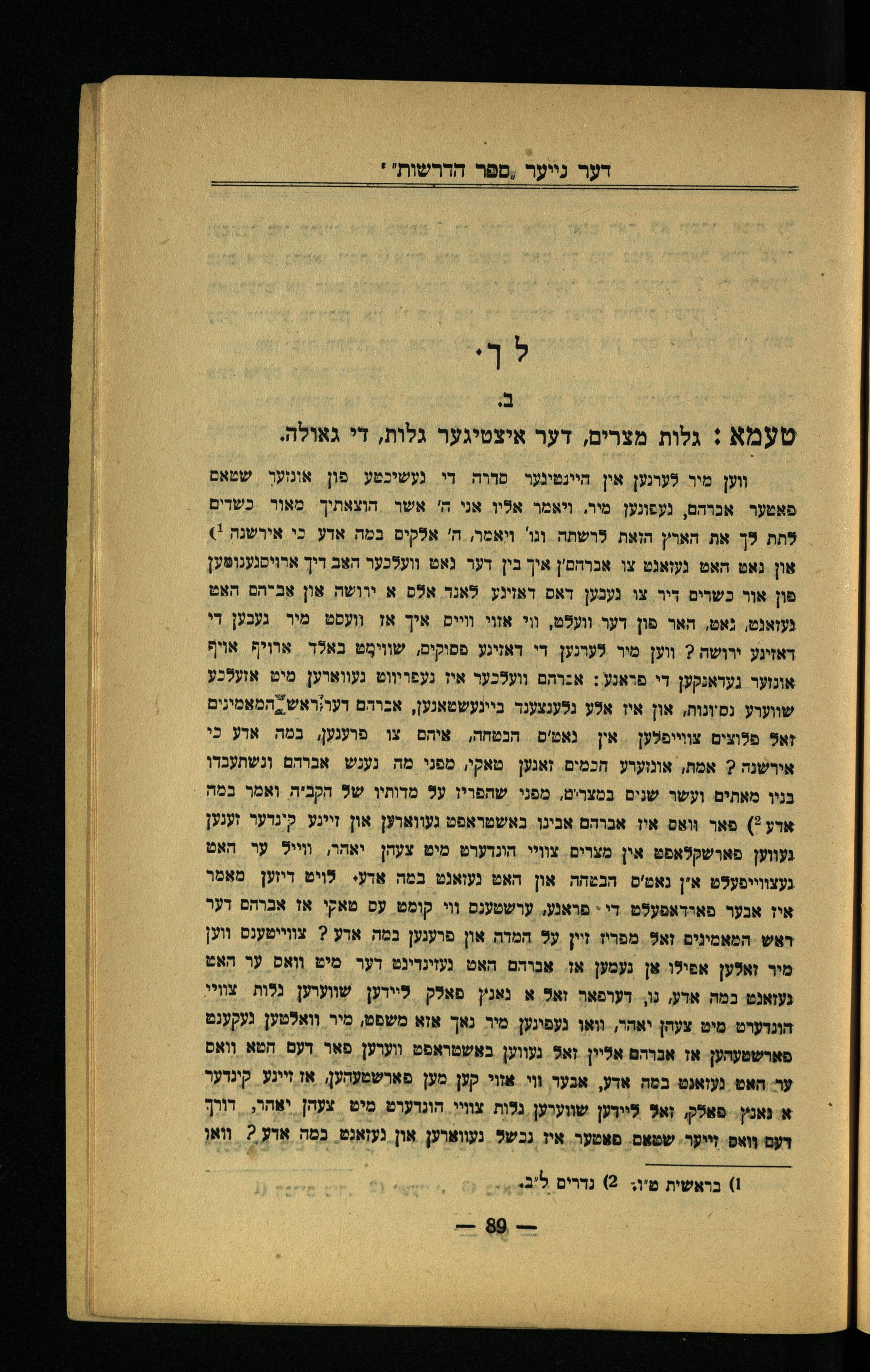 ווען מיר לערנען אין היינטינער פהרה די געשיכטע פון אונזעך שטאס פאטער אכרהם, נעפונען. מיר.. ויאמר אלין אני ה' אשו הוצאתיך מאור כשרים לחת לך את הארץ הזאת לרשתה ונו' וואמר, ה' אלקיס במה אדע כי אירשנה!) און נאט האט געזאגט צו אכרהם'ן איך בין דער גאט וועלכער האב דיך ארויסגענומען פון אור כשרים דיר צו גענען דאס דאזיגע לאנר אלס א ירושה און אביהם האט נעזאנט, נאט, האר פון דער וועלט, וי אזוי ווייס איך אז וועסט מיר געבען די דאזינע ירושה? ווען מיר לערנען די דאזיגע פסוקים, שווימט באלד. אוויף אױיף אונזער געראנקען די פראנע: א2רהם ועלֿכער איז געפריווט געווארען מיט אועלכע שווערע נסיונות, און איז אלע נלֿענצענד בייגעשטאנען, אברהם דער:ראשהמאמינים זאל פלוצים צווייפלען. אין נאט'ם הנשחה, איהם צו פרענען, במה ארע כי אירשנה? אמת, אונזערע חכמים זאגען מאקי, מפני מה נענש אברהם ונשתעכדו בּנין מאתים ועשר שנים במצריט, מפני שהפריז על מדותין של הקביה ואמר במה. אדע?) פאר וואס איז אברהם אכינו נאשטראפט געווארען און זיינע. קינרער זענען געווען פארשקלאפט אין מִצריִם. צוויי הונדערטש מיט צעהן. יאהר, וייל ער האט געצווייפעלט א'ן נאט'ם הנטחה און האט נעזאנט במה אדע.. לוט דיזען מאמר איז אנער פאידאפעלט די* פראנע, ערשטעגס וו קומט עס מאקי אז אברהם דער דאש המאמינים זאל מפריז זיין על המדה און פרענען במה אדע? צווייטענס ווען מיר זאלען אפילו אן נעמען. אז. אנוהם האט. געזינדינט דער מִיט וואס. ער הָאט געזאנט כמה אדע, נו, דערפאה זאל א נאנץ פאלק ליידען שׁווערען גלות. צוויי הונדערט מיט צעהן יאהר, וואן נעפונען. מיר נאך אזא מִשְפט, מיר וואלטען. געקענט פארשטעהען אז אברהם אליין זאל. נעווען באשטראפט ווערען פאר דעם הטא וואס ער האט נעזאגט במה אדע, אגער. וי אזוי. קען מען פארשמעהען, אז זיינע. קיגרער א נאניץ. פאלק, זאל ליירען שווערען גלות צוויי. הונדערט. מיט. צעהן יִאהר,. דוֹרְךְ דעם וואס. זייער שטאם. פאטער. איז גבשל געווארען און געזאנט. במה ארע 2 וואן