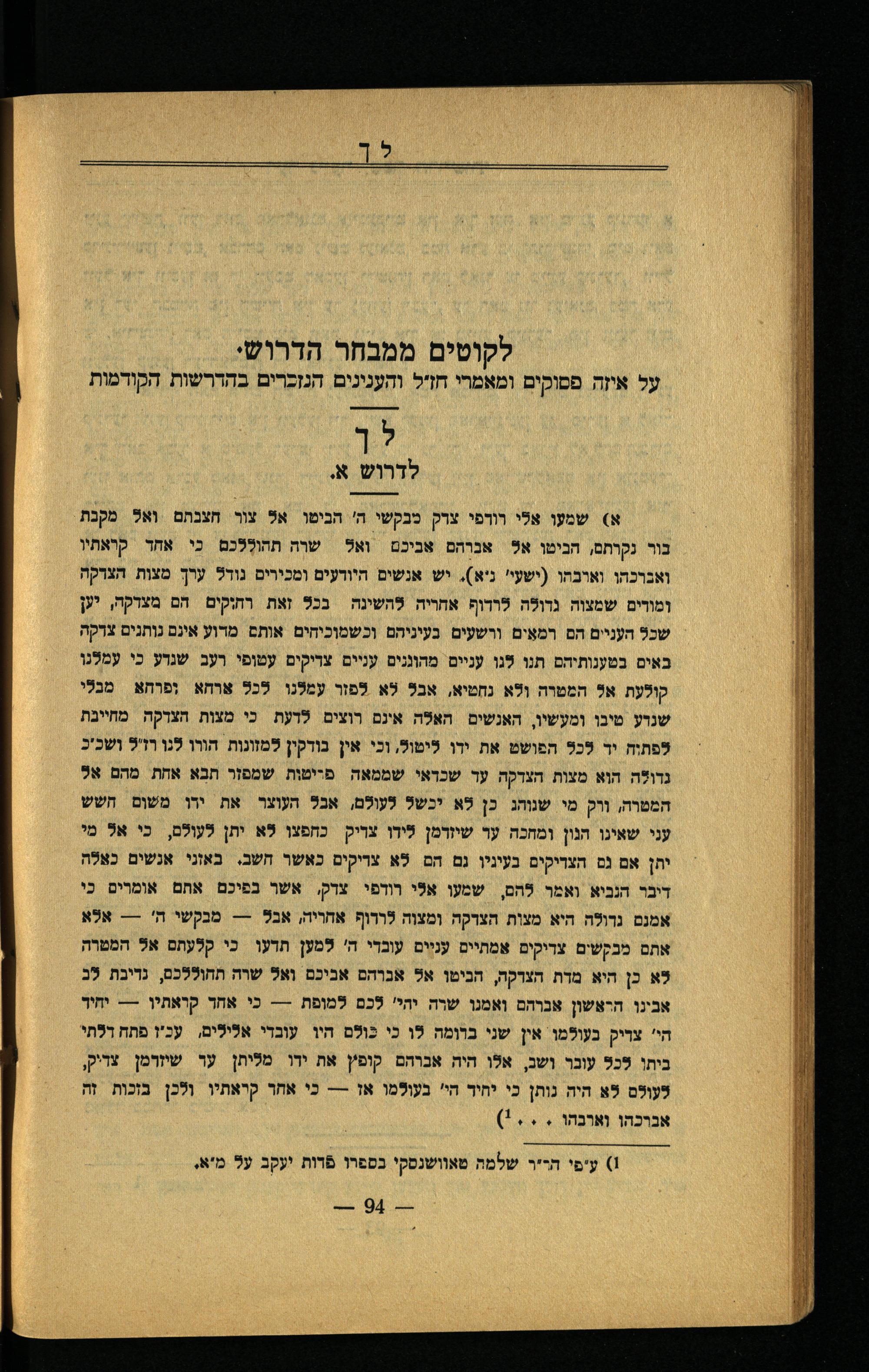 א) שמען אלי רורפי צרק מבקשי ה' הביטו אל צור חצנתם ואל מקבת. בור נקרתם, הביטו אל אברהם אביכט ואל שרה תהוללכם כי אחד קיאתיו ואברכהו וארבהו(ישעי! ניא). יש אנשים היודעים ומכירים נודל ערך מצות הצרקה ומודים שמצוה נדולה לררוף אחריה להשיגה בכל זאת רחוקים הם מצדקה, זען שכל העניים הם ומאים ורשעים כעיניהם וכשמוכיהים אותם מדוע אינם נותנים צרקה באים בטענותיהם תנו לגו עניים. מהוגנים עניים צריקים עטופי רעב שנדע כי עמלנו קולעת אל המטרה ולא נחטיא, אבל לא לפזו עמלנו לכל ארחהא ויפרחא מבלי שנוע טיבו ומעשיו, האנשים האלה אינם רוצים לדעת כי מצות הצדקה מחייבת לפתוח יד 5כל הפושט את ידו ליטול, וכי און בודקין למזונות הורו לנו ח"ל ושכ'כ גדולה הוא מצות הצדקה עד שכדאי שממאה פייטות שמפזר חבא אחת מהם אל המטרה, ויק מִי שִנוהג כן לא יכנשל לעולם, אבל העוצר את ידן משום השש עני שאינו הִגּון ומחכה ער שיזרמן לידו צדיק כחפצו לא יתן לעולם, כי אל מי יהן אם גם הצריקים בעיגין גם הם לא צריקים נאשר חשב. באזני אנשים כאלה דיבר הנביא ואמר להם, שמען אלי רודפי צדקו אשר בפיכם אחם אומרים כי אמנט נדולה היא מצות הצרקה ומצוה לררוף אחריה, אבל-- מבקשי ה'-- אלא אתס מבקשים צדיקים אמחיים עניים עובדי ה' למען תדעו כי קלעתם אל המטרה לא כן היא מדת הצרקה, הביטו אל אנוהם אביכס ואל שוה תחוללכם, גריבת לב אבינו הראשון אנוהם ואמנו שרה יהי' לכם למופת--- כי אחר קואתיו-= יחיר היי צריק בעולמו אין שני ברומה לו כי בּולם היו עובדי אלילים, ענ'ן פתח דלתי' ביתו לכל עובר ושנ, אלו היה אכוהם קופץ את ידו מליתן ער שיזרמן צריק, לעולם לא היה נותן כי יחיך הי' בעולמו אז-- כי אחר קיאתיו ולכן בזכות זה אברכהו וארכהו..,!)
