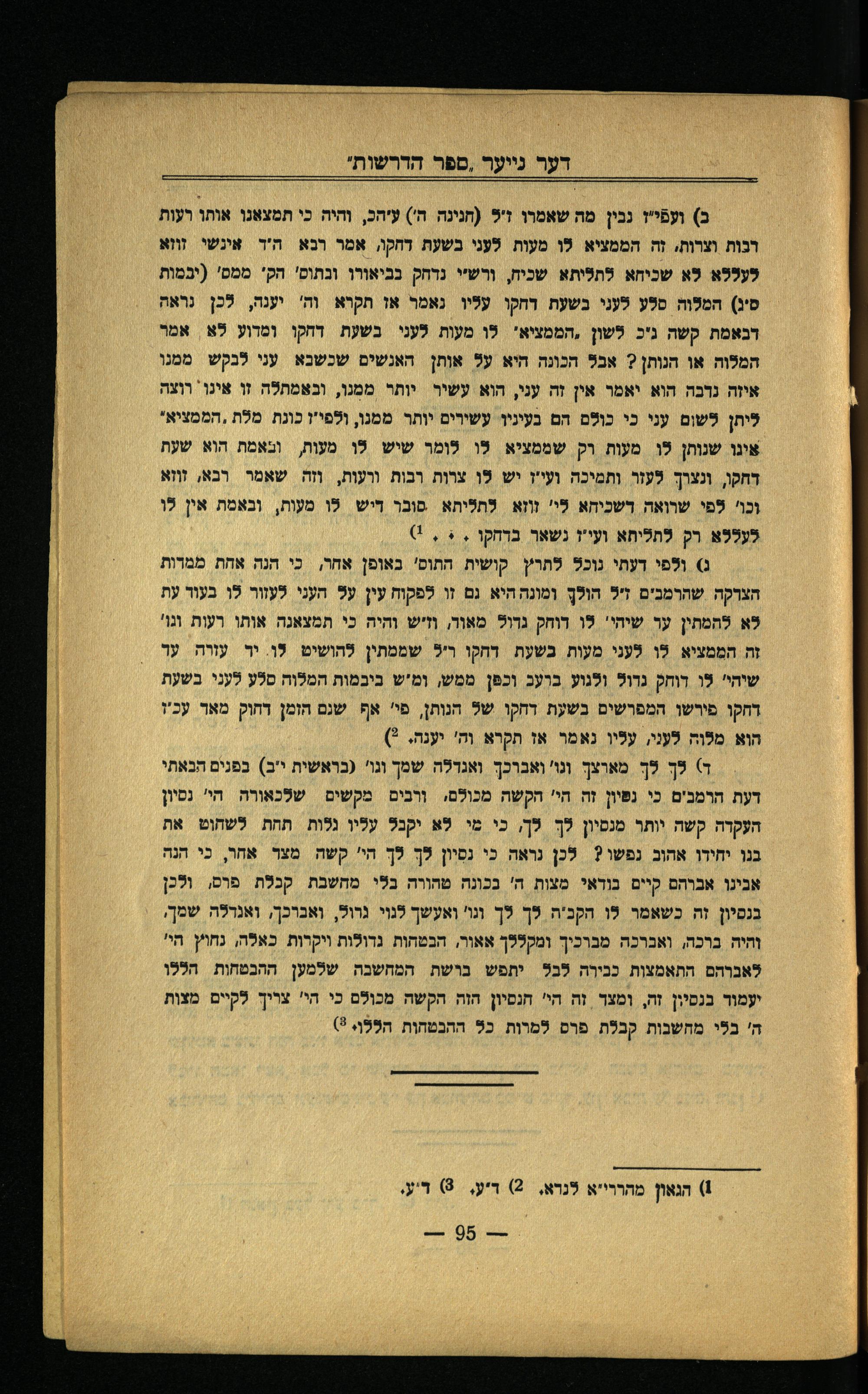 ב) װעפֿייז נבין מה שאמרו ז'ל(חנינה ה') עיהכ, והיה כי תמצאנו אותו רעות דכות וצרות. זה הממציא לו מעות לעני בשעת דחקו, אמר רכא ה'ד אינשי זווא לעללא לא שכיחא לתליתא שכיח, ורש"י נדחק נביאורו ונתום' הק' ממס'(יבמות סיג) המלוה סלע לעני בשעת דחקו עליו נאמר או תקרא וה' יענה, לכן נראה דכאמת קשה גיכ לשון-המפציא' לו מעות לעני בשעת דחקו ומדוע לא אמר המלוה אן הנותן? אבל הכונה היא על אותן האנשים שכשכא עני לבקש ממנן איזה נדכה הוא יאמר אין זה עני, הוא עשיר יותר ממנן, ובאמתלה זו אינו רוצה ליחן לשום עני כי כולם הם בעינין עשירים יותר ממנו, ולפי"ו כונת מלת ,הממציא" אינו שנותן לו מעות וק שממציא לו לומר שיש לו מעות, ובאמת הוא שעת דחקו, ונצרך לעזו ותמיכה ועי"ז יש לו צוות רבות ורעות, וזה שאמר רבא, זווא וכו' לפי שרואה דשכיחא לי' זוזא לתליחא סובו דיש לו מעות, ובאמת אין לו לעללא רק לתליחא ועי"ז נשאר בדחקו.+.!)