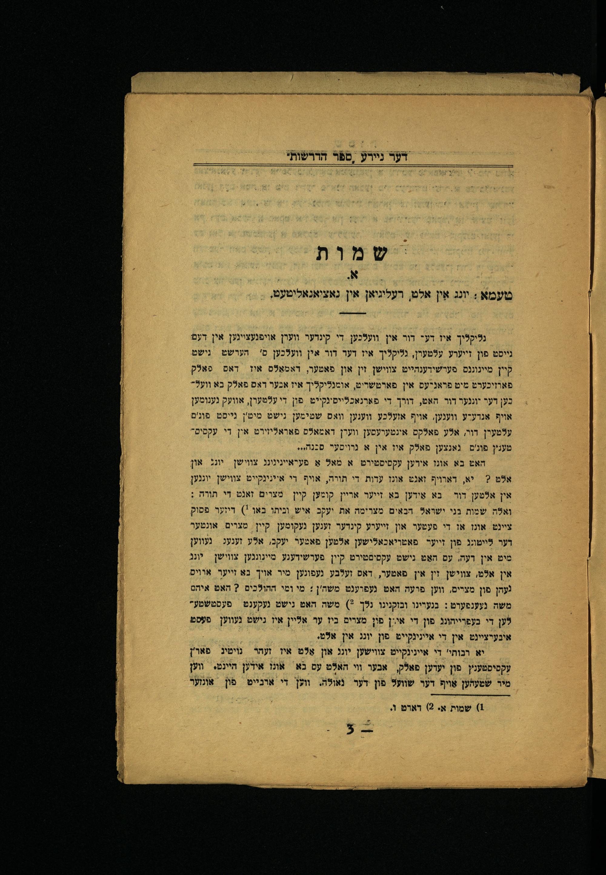 יא רכותי' די איינינקייט צווישען יונג און אַלט איז זעהר נוימיג פאר'ן עקסיסטענץ. פון יעדען פאלק, אכער וי האלט עס נא אונז אידען היינט. ווען מיר שפעדען אַױף דער שוועל פון דער נאולה. ווען די ארנייט. אונזער