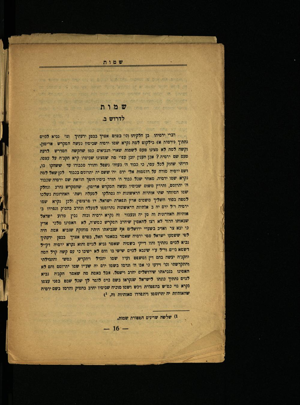 דברי ירמיהו בן חלקיהן וְנו' בטרם אעיך בכטן ידעתיך ונו' נניא לנוים גתתיך(ירמיה א) כילקוט למה נקרא שמו ירמיה שכימיו נעשה ארימון, וקשה למה לא כצינו טעם לשמות שארי הנכיאים כמו שהקשה המררש לרעת טעם שם ירמיה? אכן הענין יוכן עפ'י מה שמצינו שבימיו ק"א הקכנ"ה על עצמו, הייתי שחוק לכל עמי, כי ככור ה' כעוה' נשפל והורד מכבודו ער ששחקו בו, ושם ירמיה מורה על רוממות אל' יִרם יה' ששם יה יתרומם לכן שאל למה נקרא שמו ירמיה, מאחר שכל ככוד ה' הווד נימין היפך הוואת שם ירמיה שכבור ה' יתרומם, ותירץ משום שבימין נעשה המקדש ארימון, שהמקדש ונחלק שמו המיוחד שתי אותיות הראשונות יה נסתלקו למעלה ושת' האחרונות נשלכו למטה כסור השליך משמים אוץ תפארת ישראל, דו פוצופין, ולכן נקרא שמו ירמיה ר"ל ירם יה ב אותיות היאשונות נתרוממו למעלה ונחרב כהמ'ק ונפרדן בי אותיות האחלונית וה מן יה זה נקרא ירמיה וכזה נכין מדוע ישראל שנאותו חדור לא רצו להאמין שיחרב המקרש כמשיה, לא האמינו מלכי ארץ כי יבא צר ואויכ בשערי ירושלים אף שנביאתו היתה מוחזקת שנביא אמת היה לפי ששמעו ישראל מפי ירמיה שאמר במאמר האל, כטום אצרך כנטן ידעתיף נכיא לנוים נתתיך והוו רייקי בשמיה שאמר נכיא לנוים והוא נקרא ירמיה רקייל דשמא נוים ו"ל ע"י שינבא לנוים שישי בו והם לא ישינו כי עם קשה קדל המה והקב"ה יעשה בהם דין ומשפט ועיז שמו יתנרל ויתקדש, כמשי והחנרלתי והתקדשתי וגו' וידעו כי אנו ה' ונומז בשמו יום יה שעייז שמו יתרומם והם לא בנניאתו שירושלים יחוב וישפל, אבל כאמת מה שאמו הקנ'ה נכיא לנוים גתתיך כונתן לישראל שנקראן נשם נויס לומו לך שכל שנט כפני עצמן גקרא גוי כמ"ש בהפטורת וינש ושמו מוכיח שכימיו יחרב כהמיק והרמז כִשׁם ירמיה שהאוחיות יה יתלוממן ויתפררו מאותיות וה, 1)